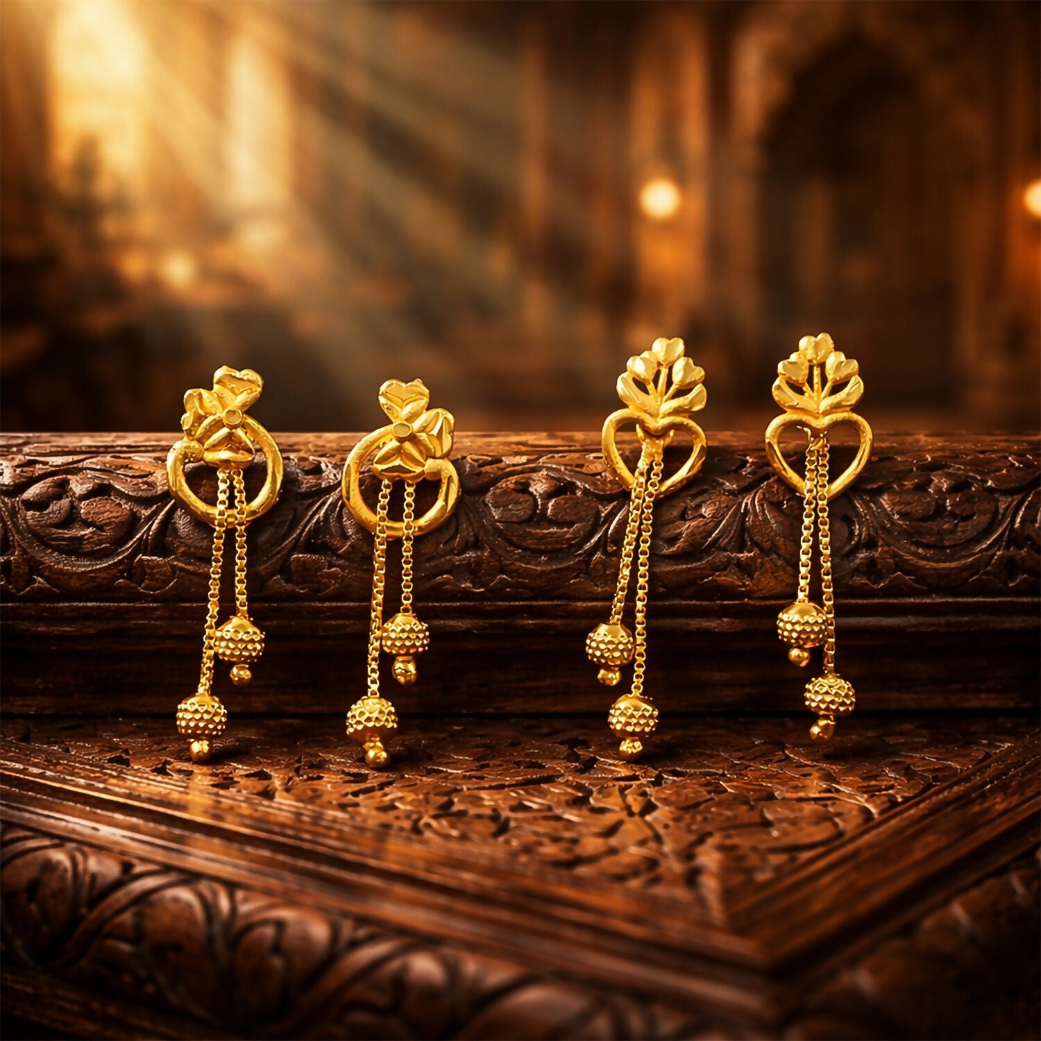 Add a touch of timeless elegance to your jewelry collection with these beautifully crafted floral heart gold drop earrings. Designed with a delicate blend of classic charm and graceful movement, these earrings feature an intricate floral-inspired top that flows into a heart-shaped frame, creating a romantic and sophisticated look. The detailed craftsmanship highlights the beauty of traditional design while maintaining a modern elegance that complements both everyday wear and special occasions.