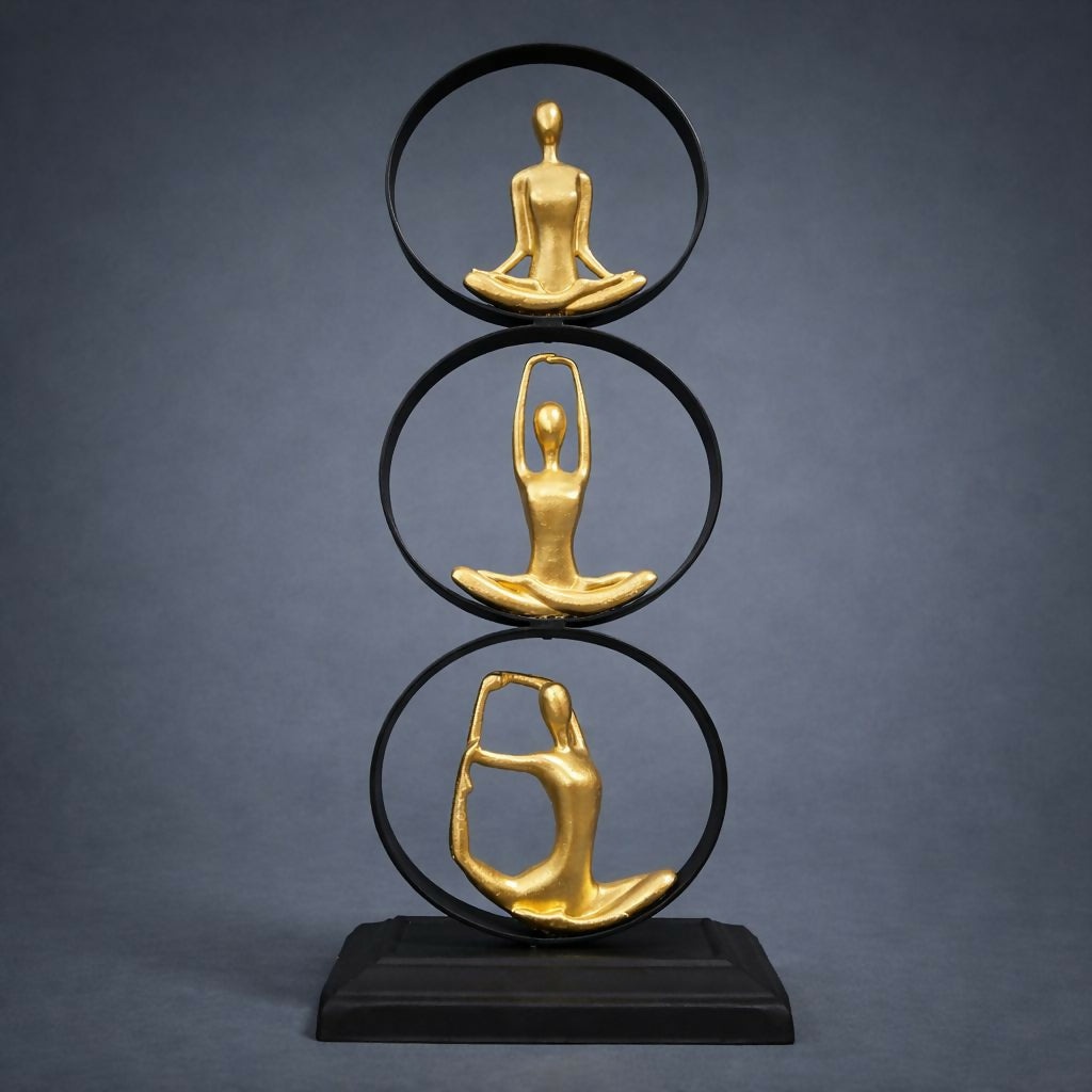 Add a touch of elegance and serenity to your home or office with this beautiful golden yoga meditation figurine showpiece. Designed with three artistic yoga poses placed inside circular frames, this modern decorative sculpture represents balance, peace, and mindfulness. The stylish black base combined with the golden finish creates a luxurious and contemporary look that enhances any interior space. Perfect for living rooms, offices, yoga studios, meditation corners, or shelves, this artistic décor piece symbolizes calmness and positive energy. It also makes a thoughtful gift for yoga lovers, wellness enthusiasts, and home décor collectors.