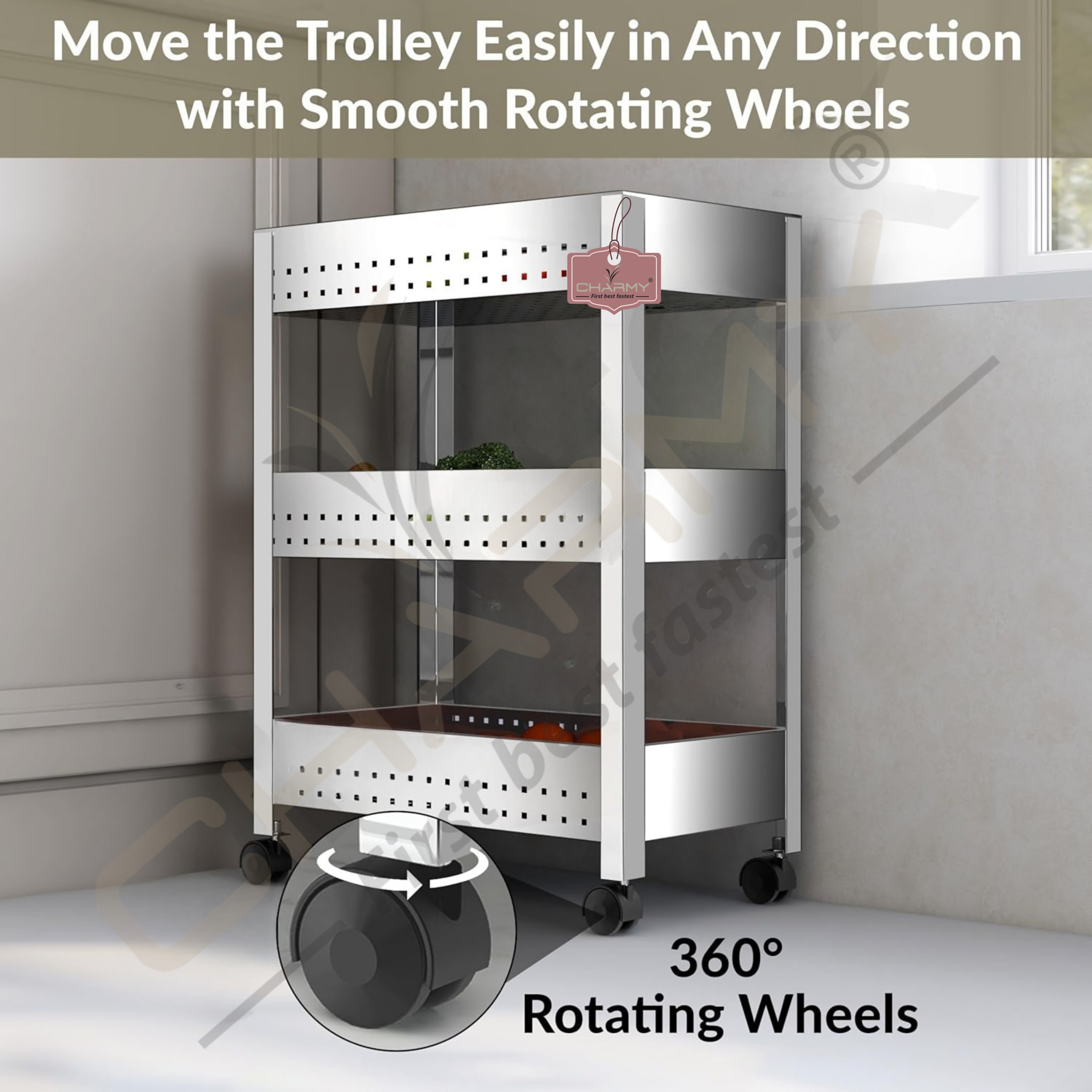 Upgrade your kitchen storage with the Charmy Stainless Steel 3-Tier Vegetable Storage Trolley — a premium-quality kitchen organizer that blends durability with functionality. This multipurpose stand is perfect for storing onions, garlic, potatoes, and fruits, or even non-kitchen items like toiletries and stationery.