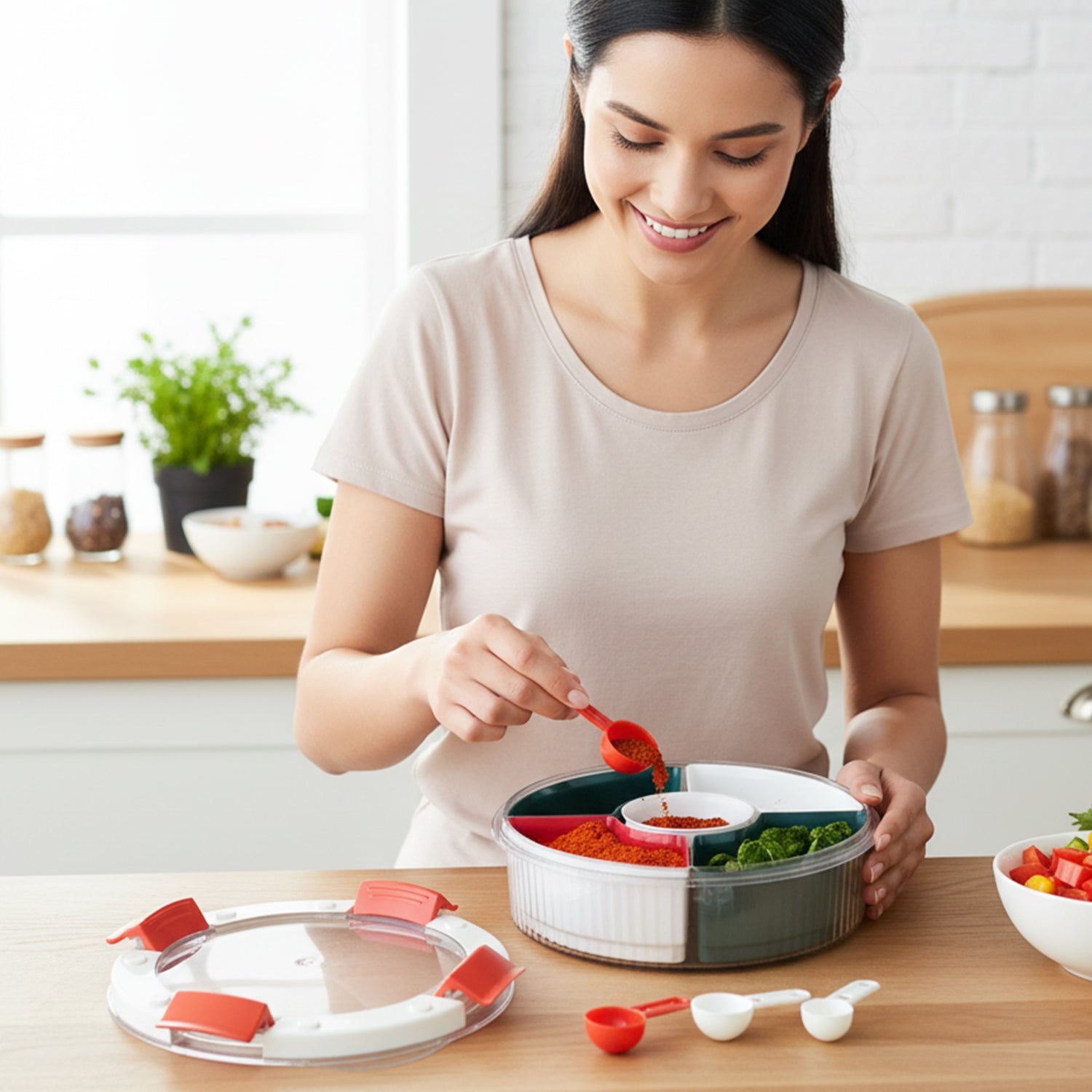 Organize your kitchen with the Plastic 5-Compartment Spice Storage Box with Spoons, a convenient spice container set for daily cooking. Each compartment stores different spices securely while included spoons allow easy measuring.
