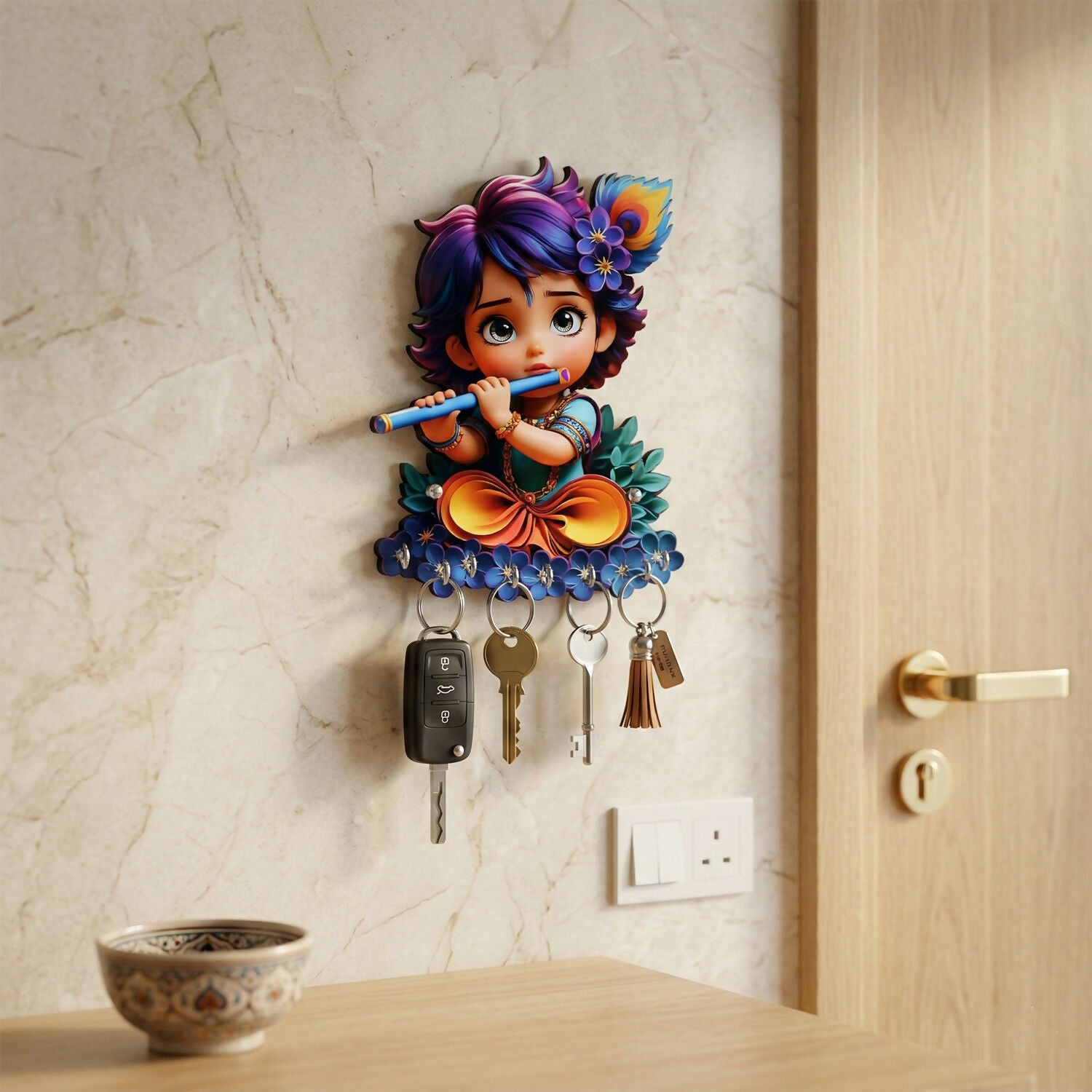 Add a spiritual and artistic touch to your home with this beautifully designed Krishna-themed wooden key holder. Featuring a vibrant, detailed illustration of a flute-playing child design, this wall-mounted key stand doubles as décor and a practical organizer. It comes with multiple sturdy hooks that allow you to neatly arrange keys, keychains, small accessories, and other daily essentials in one place. The no-drill self-adhesive mounting system ensures easy installation without damaging your walls. Perfect for entryways, living rooms, or offices, this key holder keeps your space organized while enhancing the overall look of your interior.