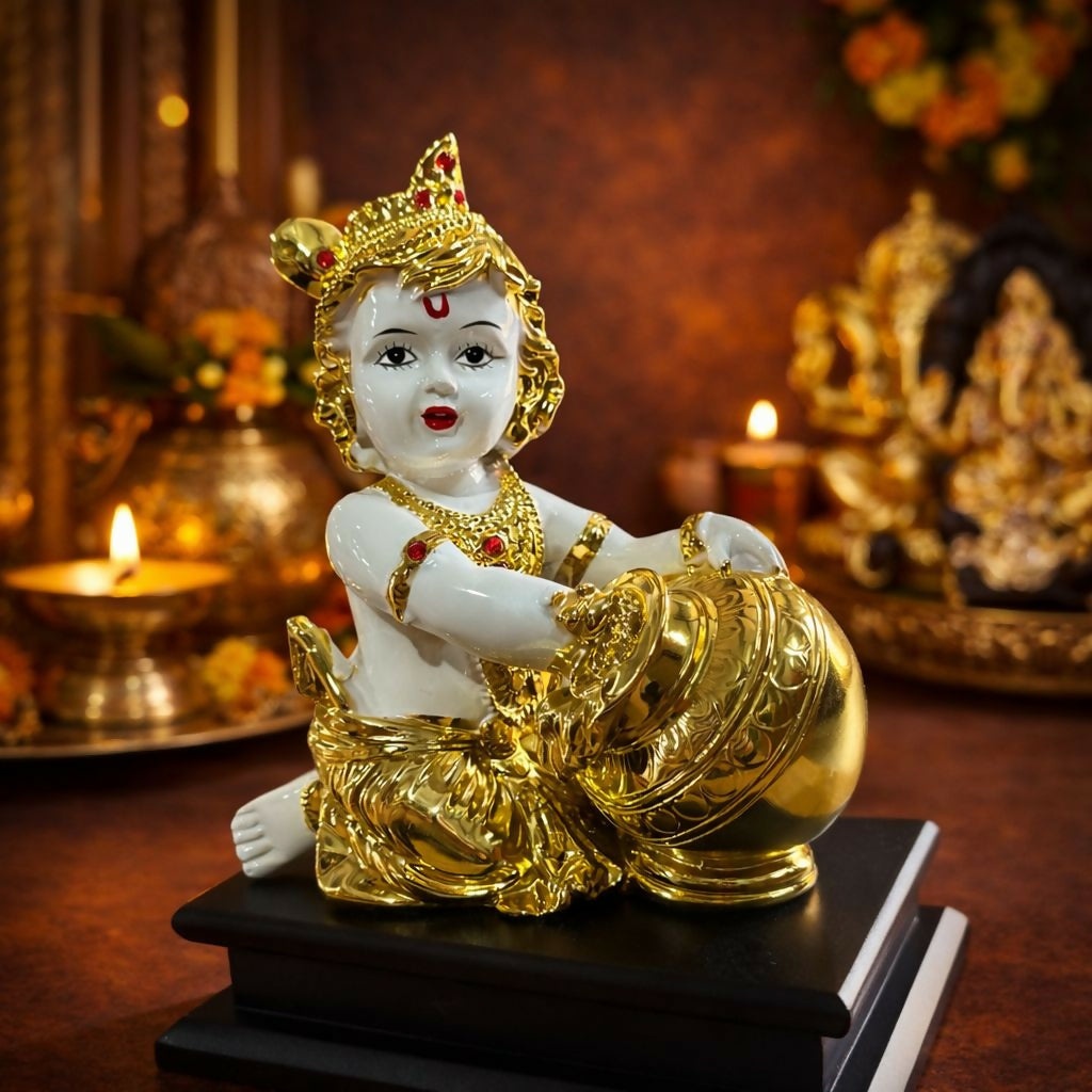 Bring divine blessings and charm to your home with this beautifully crafted Bal Krishna idol holding a butter pot. Designed with elegant detailing and a radiant golden finish, this decorative statue represents innocence, prosperity, and devotion. The idol is placed on a sturdy base, making it ideal for home temples, living rooms, offices, or spiritual spaces. Perfect for daily worship, festive décor, and gifting on occasions like Janmashtami, housewarming, Diwali, and weddings, this Bal Krishna showpiece adds a sacred and elegant touch to any environment.