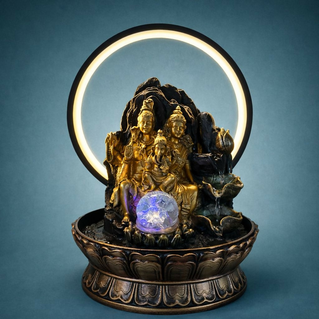 shiv parivar fountain, shiva family decor, LED water fountain, pooja room decor, spiritual tabletop fountain, halo ring light decor, home temple decor item, indoor decorative fountain, religious home decor, meditation water feature, festival gift item, devotional fountain