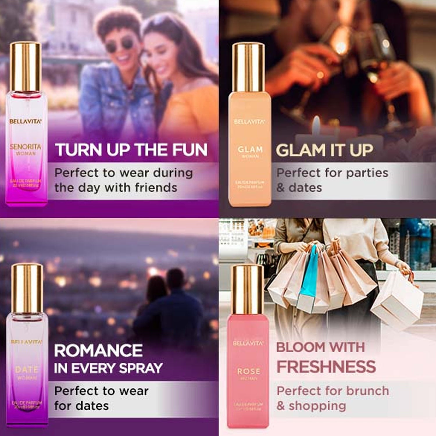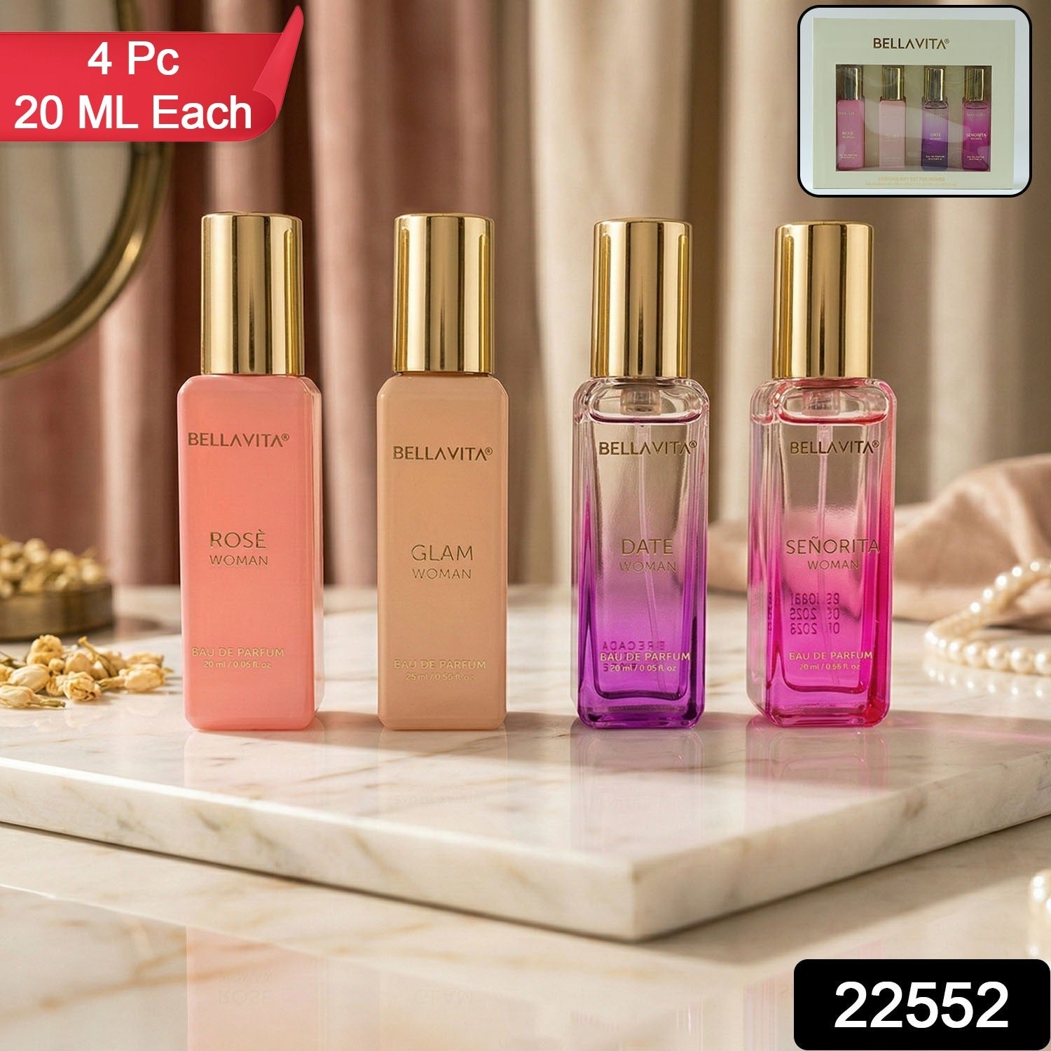 Bellavita Luxury Women Eau De Parfum Gift Set with Rose Woman, Glam Woman, Date Woman & Señorita Woman Long Lasting Premium Fragrance Collection for Daily Wear & Special Occasions 4 Pc 20 ML Each