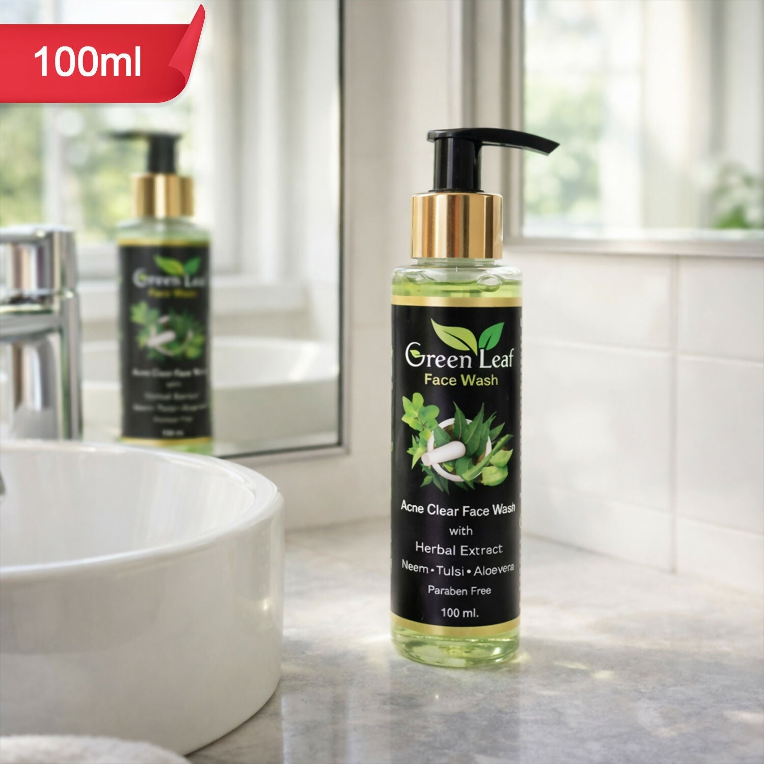 Green Leaf Acne Clear Face Wash is enriched with the natural goodness of Neem, Tulsi, and Aloe Vera to help cleanse and refresh the skin. This herbal formula helps remove dirt, excess oil, and impurities while supporting clearer-looking skin. Designed to fight acne and pimples, it gently purifies the pores without over-drying. The paraben-free composition makes it suitable for daily use and for all skin types. Its refreshing lather leaves your skin feeling clean, smooth, and revitalized after every wash.