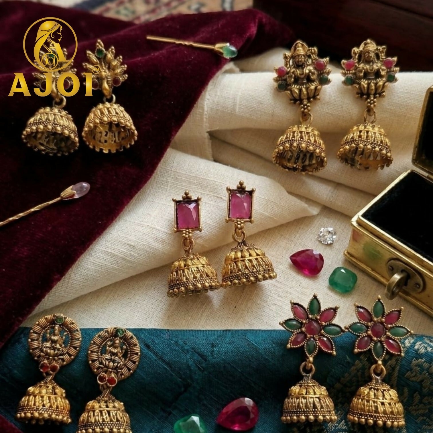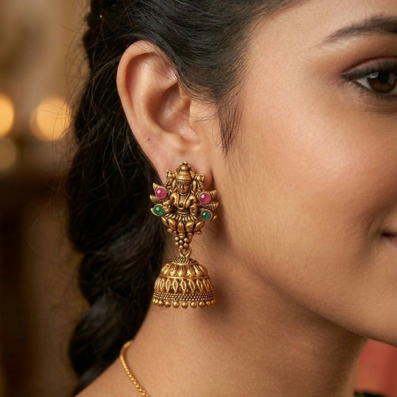Celebrate heritage craftsmanship with this exquisite Temple Gold Jhumka Collection. Featuring intricate deity motifs, floral stone embellishments, and finely detailed dome designs, each pair radiates traditional elegance. Accented with ruby and emerald-toned stones, these earrings are perfect for weddings, festive occasions, and timeless ethnic styling.