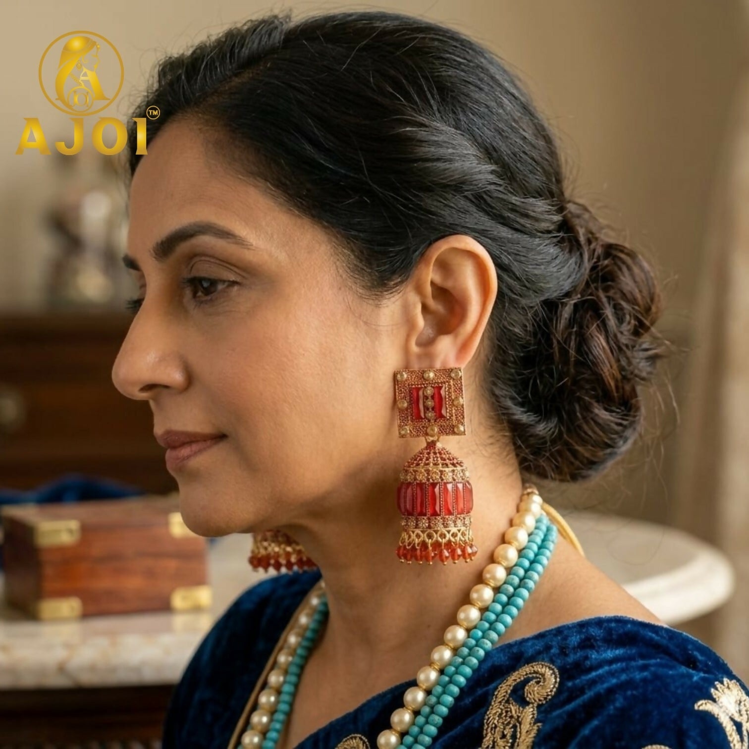 The design flows into a beautifully structured dome-shaped jhumka adorned with symmetrical red stone inlays and delicate gold beaded textures. The finely detailed craftsmanship enhances the richness of the antique finish, while the lower edge is accented with petite red crystal bead danglers that add graceful movement and a vibrant festive glow.