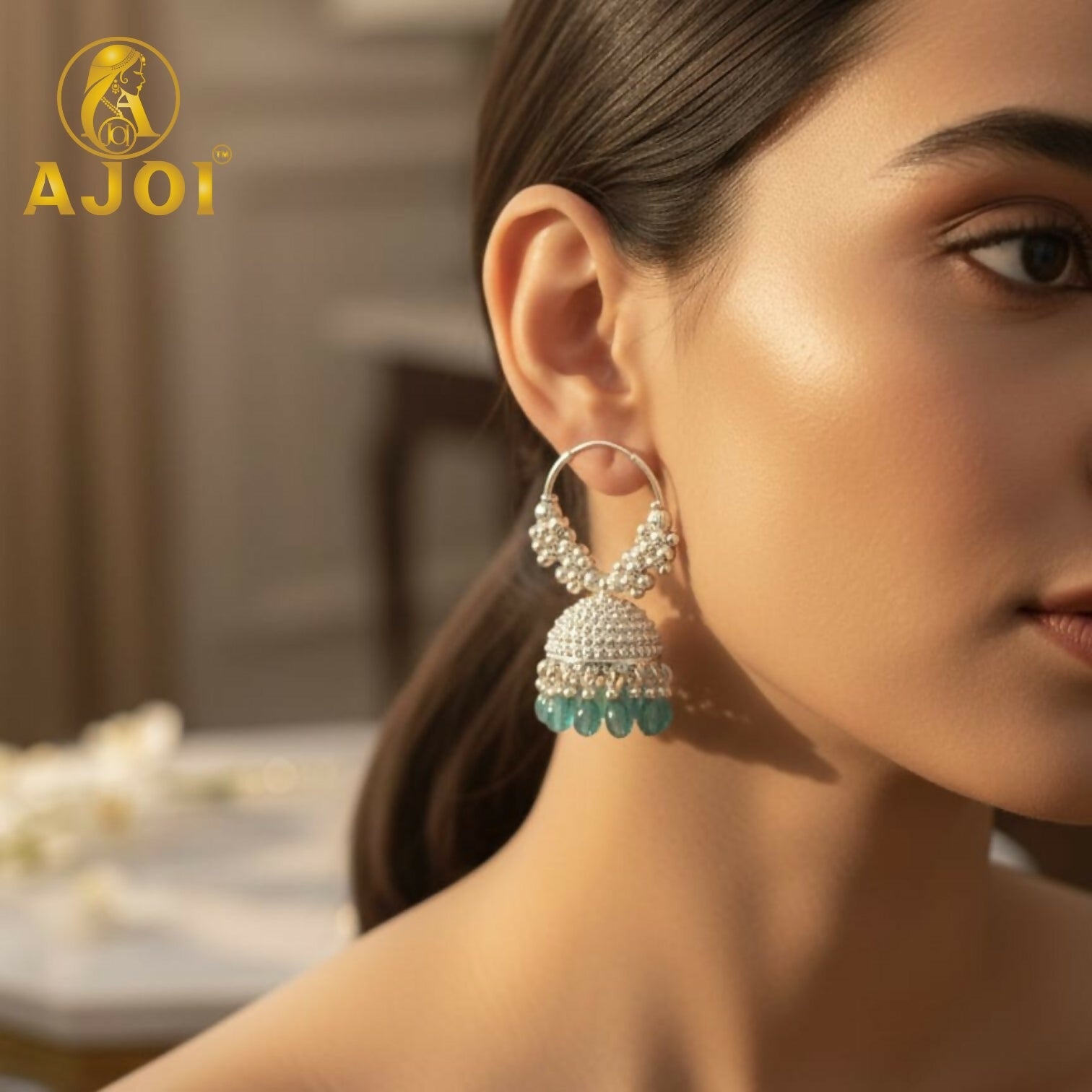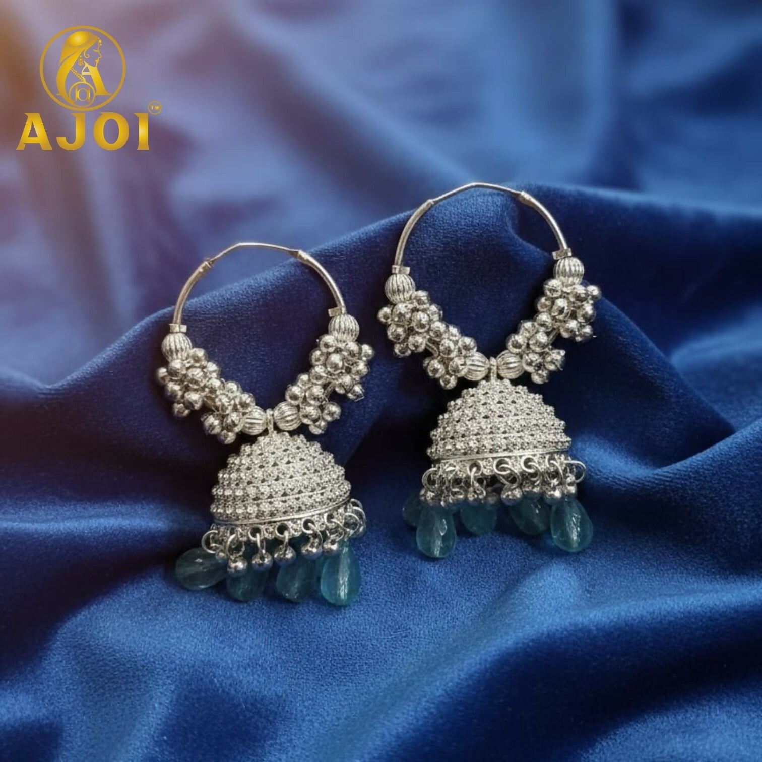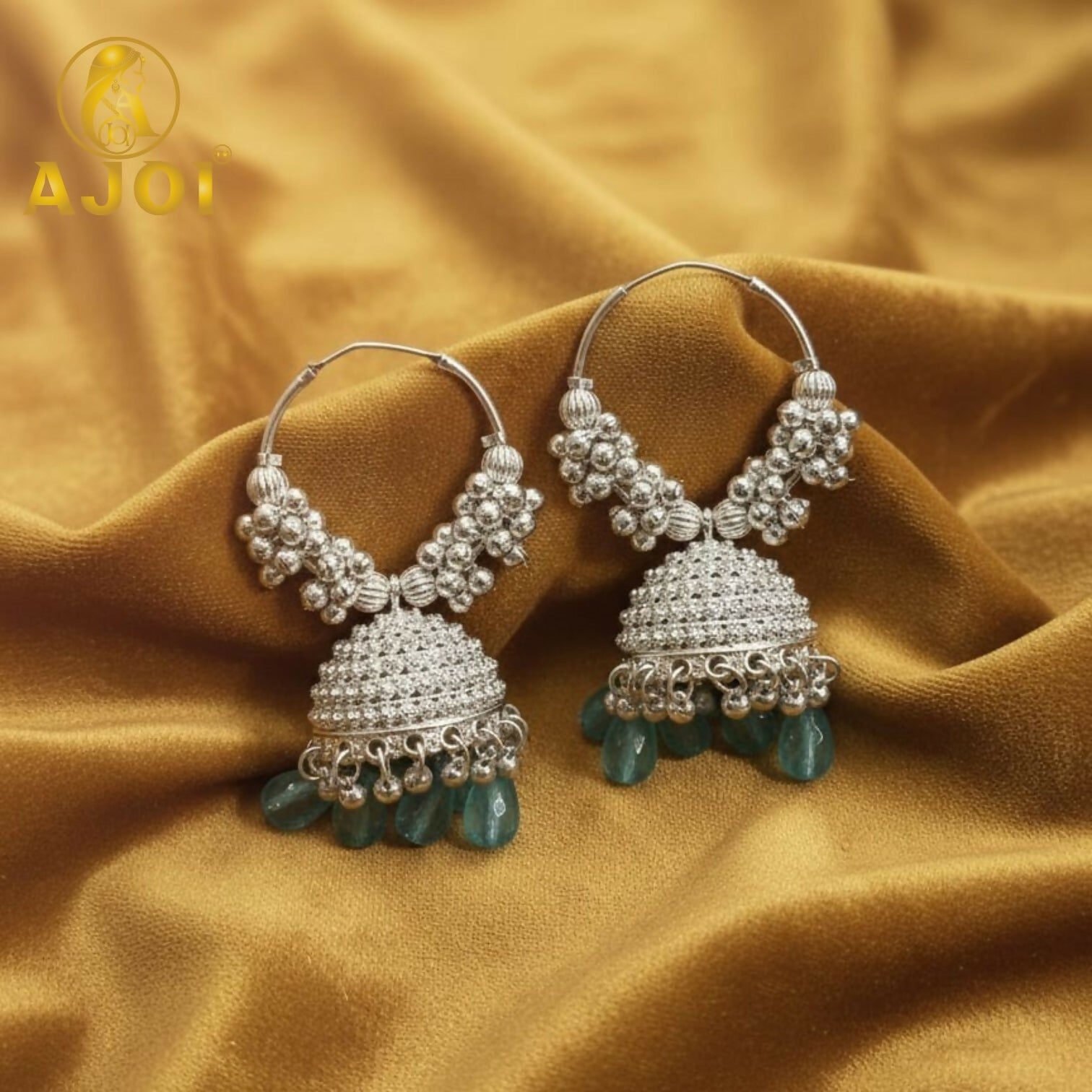 Elevate your ethnic elegance with these intricately crafted silver jhumka hoop earrings. Featuring detailed floral beadwork and a textured dome design, beautifully finished with soothing teal drop beads, this pair blends traditional charm with contemporary grace—perfect for festive wear, weddings, and special occasions.