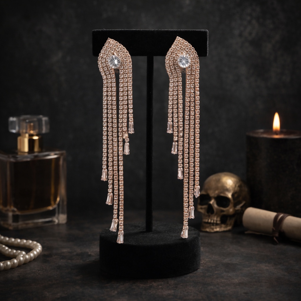 Elevate your style with these luxurious rose gold chandelier earrings, beautifully designed with a teardrop-shaped top encrusted in shimmering cubic zirconia. The cascading strands of sparkling stones and delicate baguette crystal drops create a graceful, flowing silhouette that catches the light from every angle. Perfect for evening parties, weddings, and special occasions, these statement earrings add a bold yet elegant touch to any outfit.Â