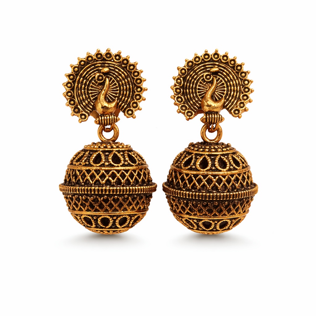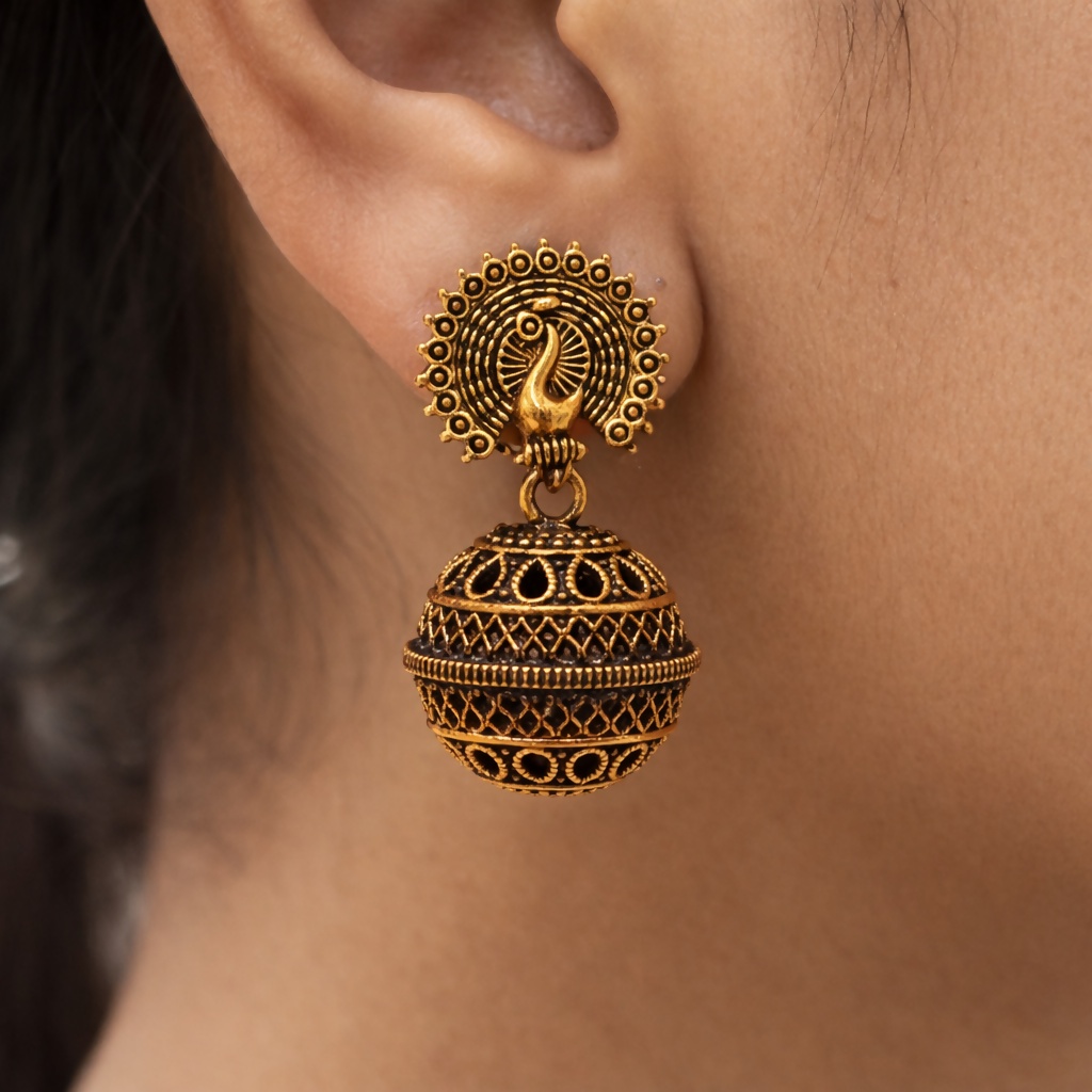 Enhance your traditional look with these beautifully crafted antique gold jhumka earrings. Designed with a detailed peacock motif at the top and a circular engraved pattern, these earrings reflect classic Indian artistry. The dome-shaped jhumka is intricately carved with fine lattice and teardrop designs, giving it a rich and elegant appearance.