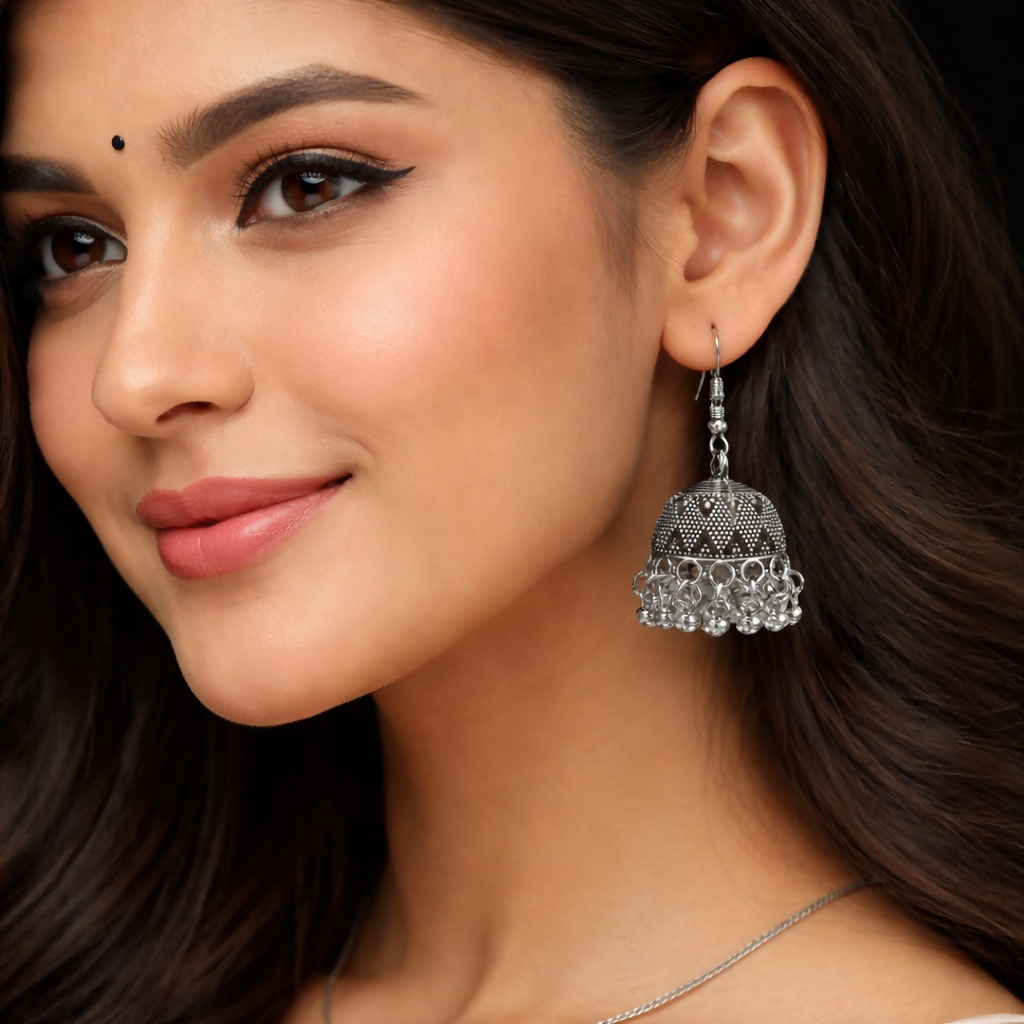 These elegant oxidized silver jhumka earrings feature a classic dome-shaped design with intricate detailing. The upper dome is beautifully textured with tiny dotted patterns and subtle triangular motifs, giving it a traditional tribal appeal. Suspended from sleek silver hooks, the jhumkas are finished with multiple dangling rings and small metallic beads that create a charming rhythmic movement. Displayed against a black background on a rustic wooden branch, these earrings offer a bold yet graceful look—perfect for ethnic wear, festive occasions, or adding a statement touch to contemporary outfits.