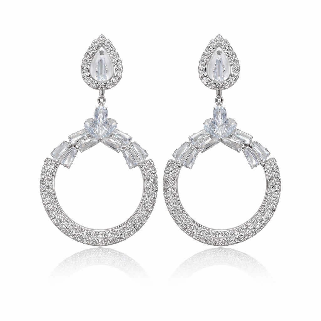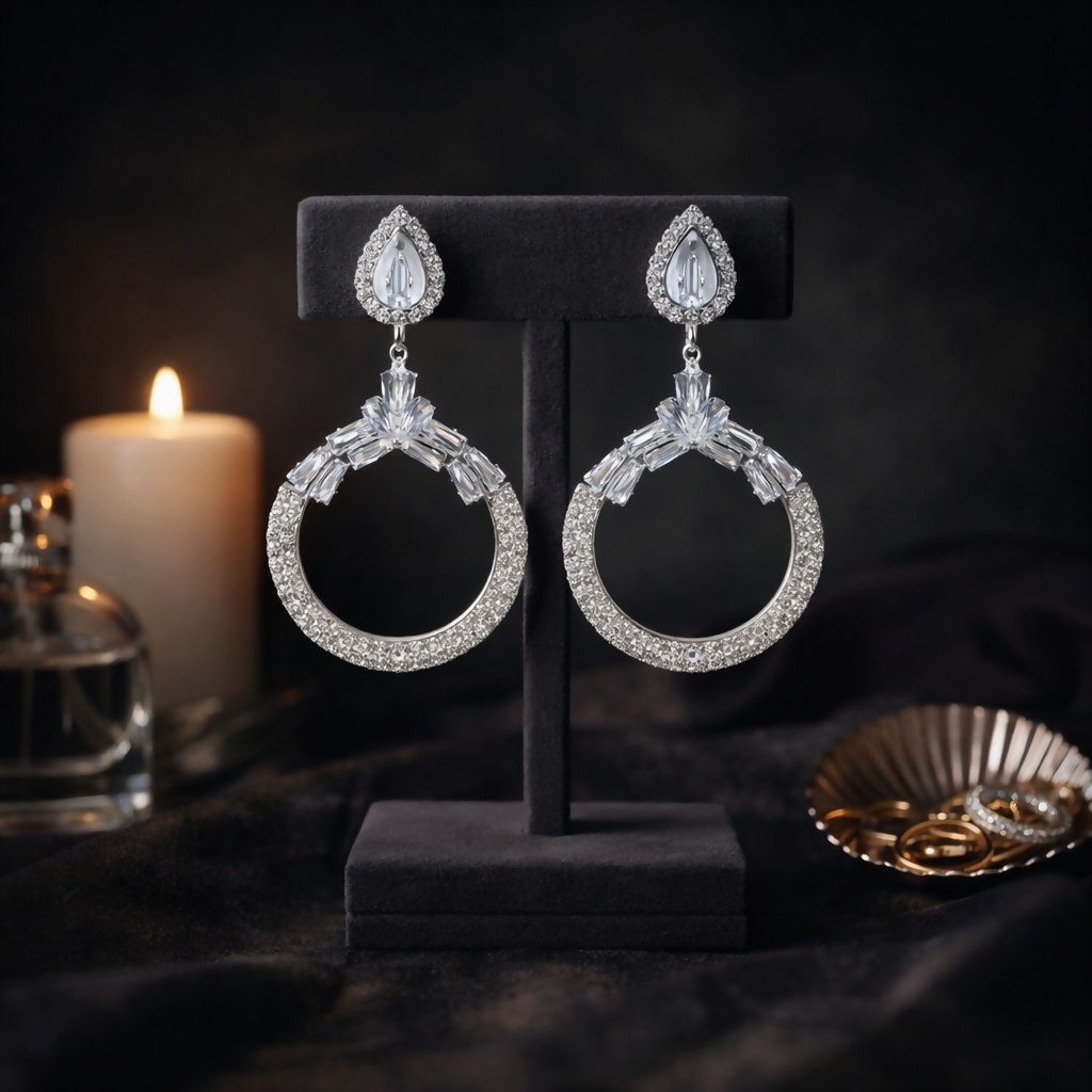 Elevate your elegance with these stunning silver-tone statement earrings, beautifully crafted in a luxurious circular drop design. The top features a delicate teardrop stud surrounded by shimmering stones, leading to a graceful hoop encrusted with fine crystals for maximum sparkle. At the center, a floral-inspired arrangement of baguette and marquise-cut stones adds a touch of sophistication and brilliance. Perfect for weddings, parties, and festive occasions, these glamorous earrings are designed to make you shine effortlessly.Â