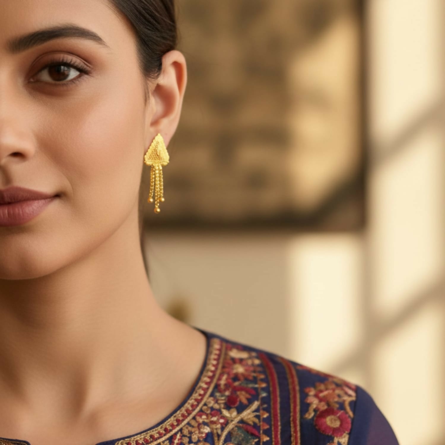 Elevate your ethnic wardrobe with these exquisitely crafted Gold-Plated Jhumka Earrings, featuring intricate filigree work and a classic bell-shaped drop. The ornate circular studs are accented with vibrant green and blue enamel touches, adding a regal pop of color to the traditional design. Finished with delicate golden beads that offer a graceful sway, these lightweight yet stunning earrings are the perfect statement piece for weddings, festivals, and special celebrations.