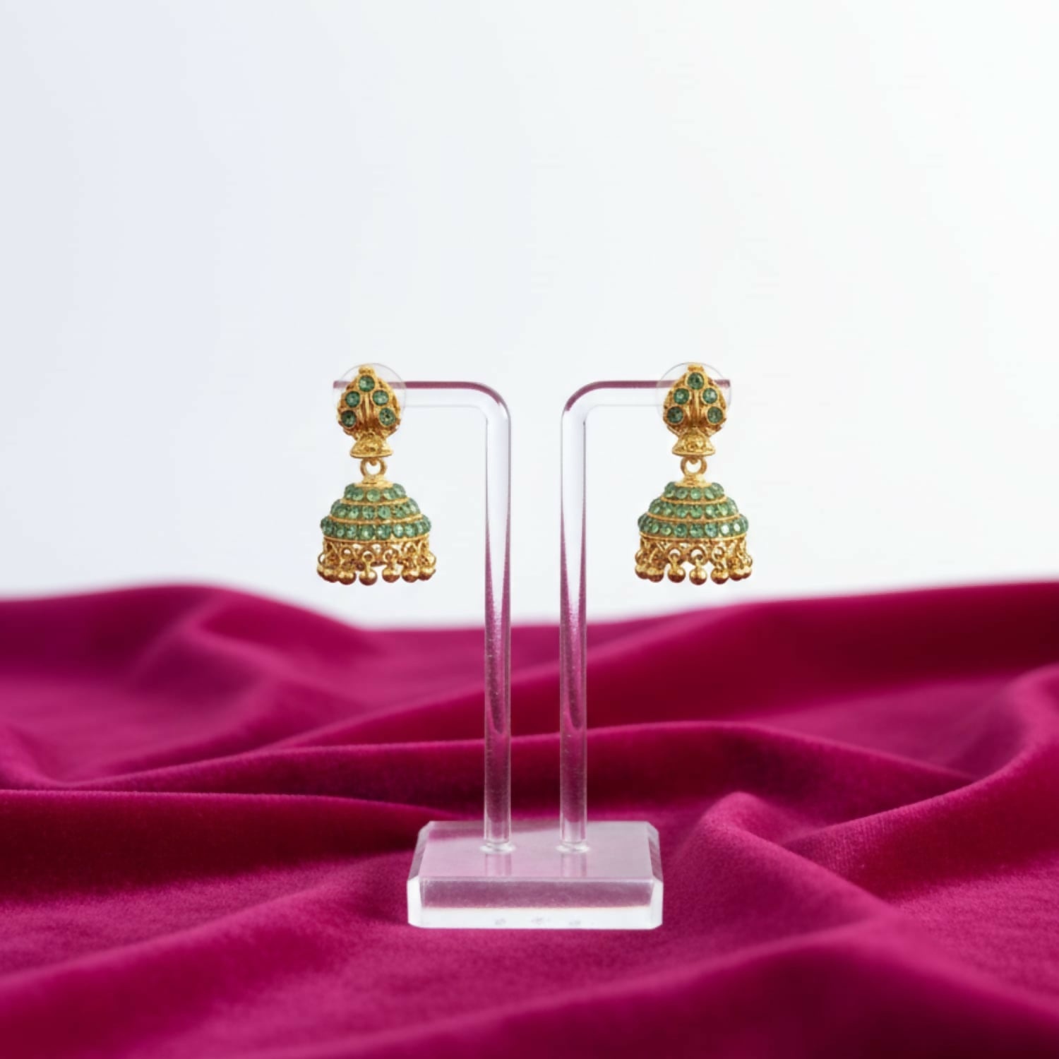 Elevate your ethnic wardrobe with these exquisitely crafted Gold-Plated Jhumka Earrings, featuring intricate filigree work and a classic bell-shaped drop. The ornate circular studs are accented with vibrant green and blue enamel touches, adding a regal pop of color to the traditional design. Finished with delicate golden beads that offer a graceful sway, these lightweight yet stunning earrings are the perfect statement piece for weddings, festivals, and special celebrations.