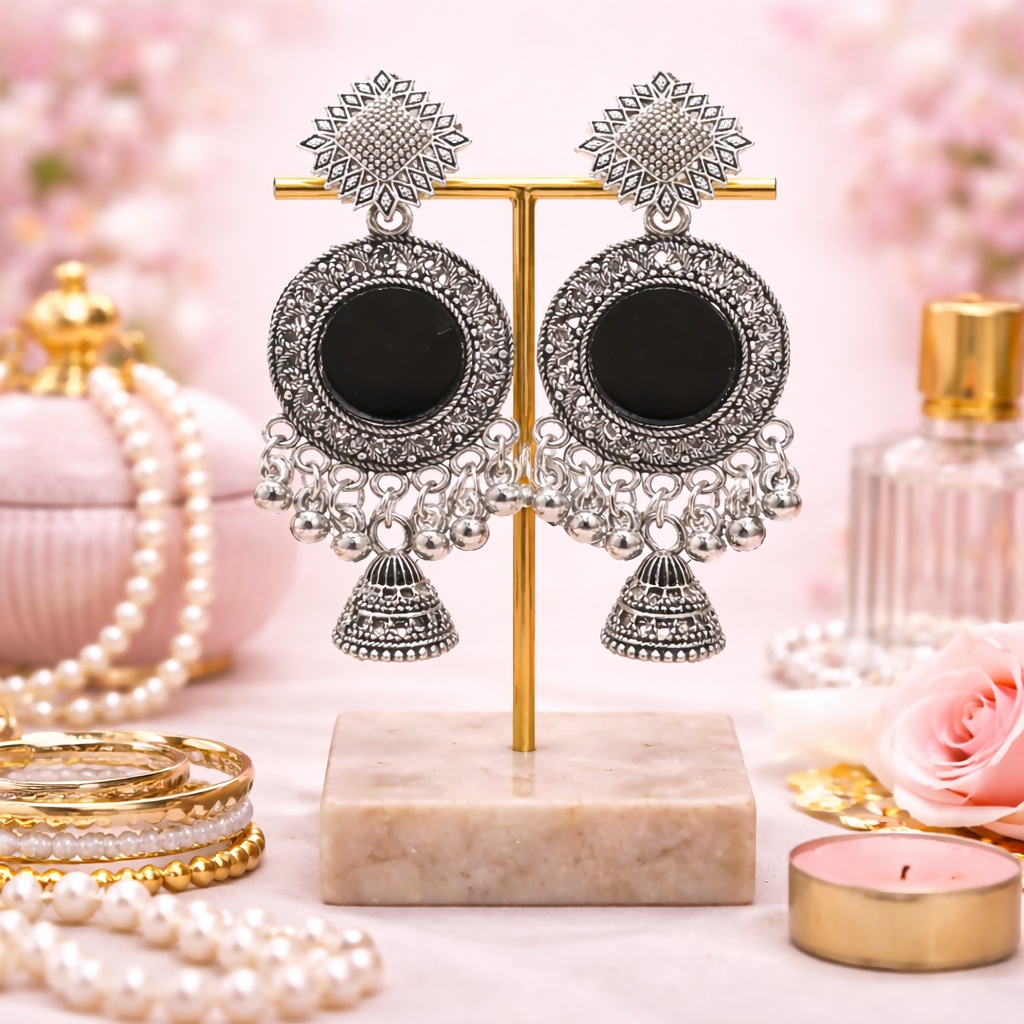 These elegant oxidized silver earrings feature a beautifully textured square stud with intricate detailing, connected to a bold circular design highlighted by a striking black stone centerpiece. The finely carved patterns around the frame enhance the antique charm, while the delicate chain danglers with tiny silver beads add graceful movement. A small traditional jhumka drop at the bottom completes the look with a classic ethnic touch. Perfect forÂ