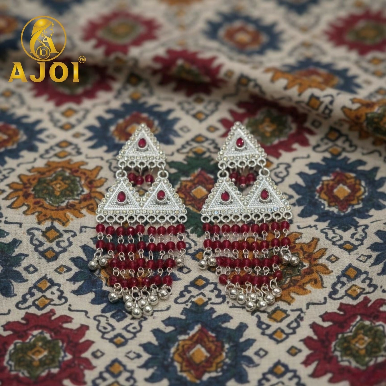 Elevate your ethnic style with these premium silver-tone triangle earrings, beautifully adorned with ruby red stones and delicate hanging beads. A perfect blend of tradition and elegance for festive and wedding wear.