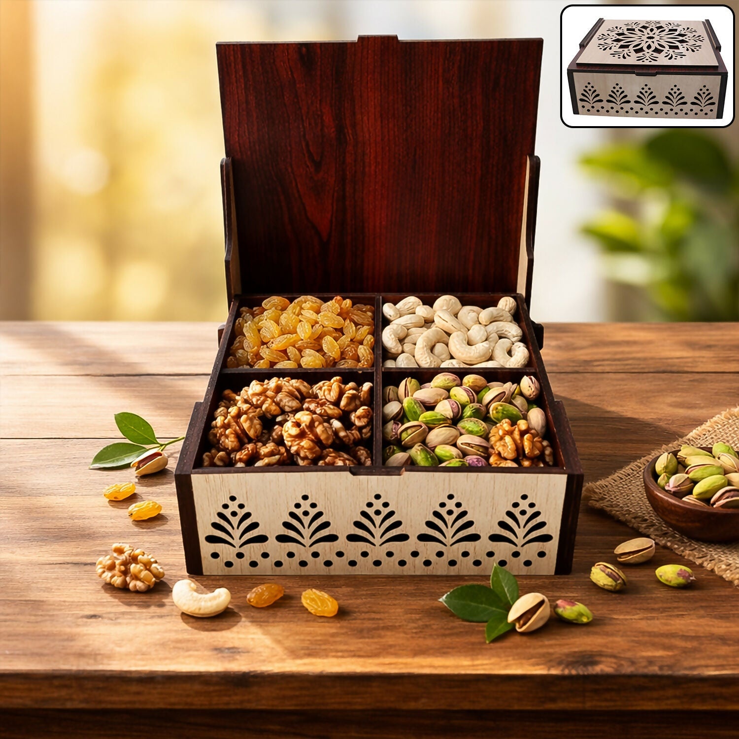Elegant 4 Section Wooden Dry Fruit Storage Box with Laser Cut Designer Lid