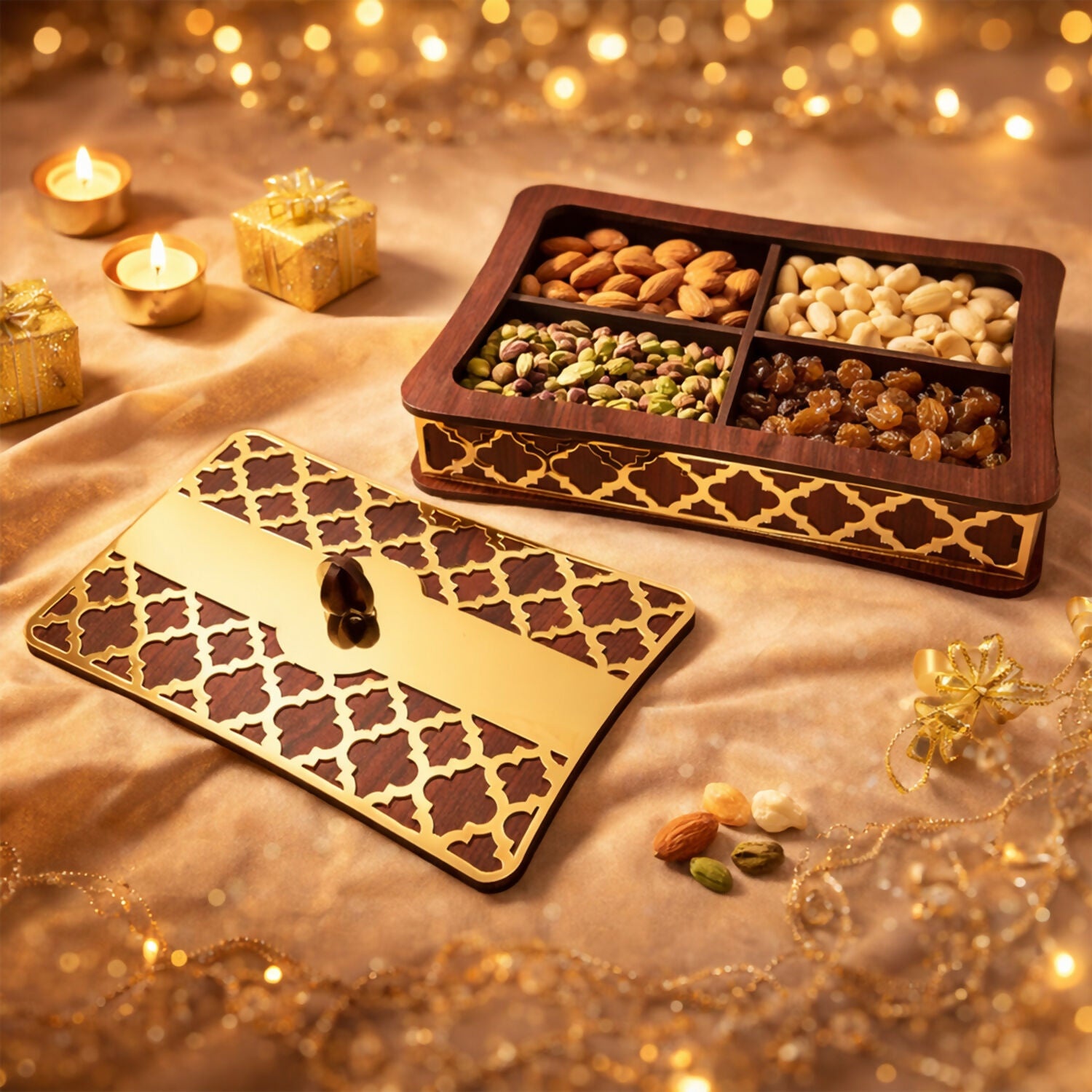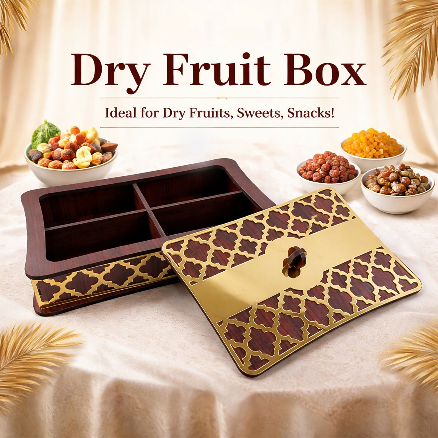Add elegance to your serving collection with this beautifully designed wooden dry fruit storage box featuring four spacious compartments and a decorative golden patterned lid. Crafted with a rich wooden finish and intricate detailing, this multipurpose box is perfect for storing almonds, cashews, pistachios, raisins, and other snacks in an organized manner. The sturdy lid helps keep contents protected while enhancing the overall premium look. Ideal for festive occasions, family gatherings, and daily use, this storage box also makes a thoughtful gift for weddings, Diwali, housewarming ceremonies, and celebrations. Its stylish design allows it to double as a decorative centerpiece for your dining or coffee table.