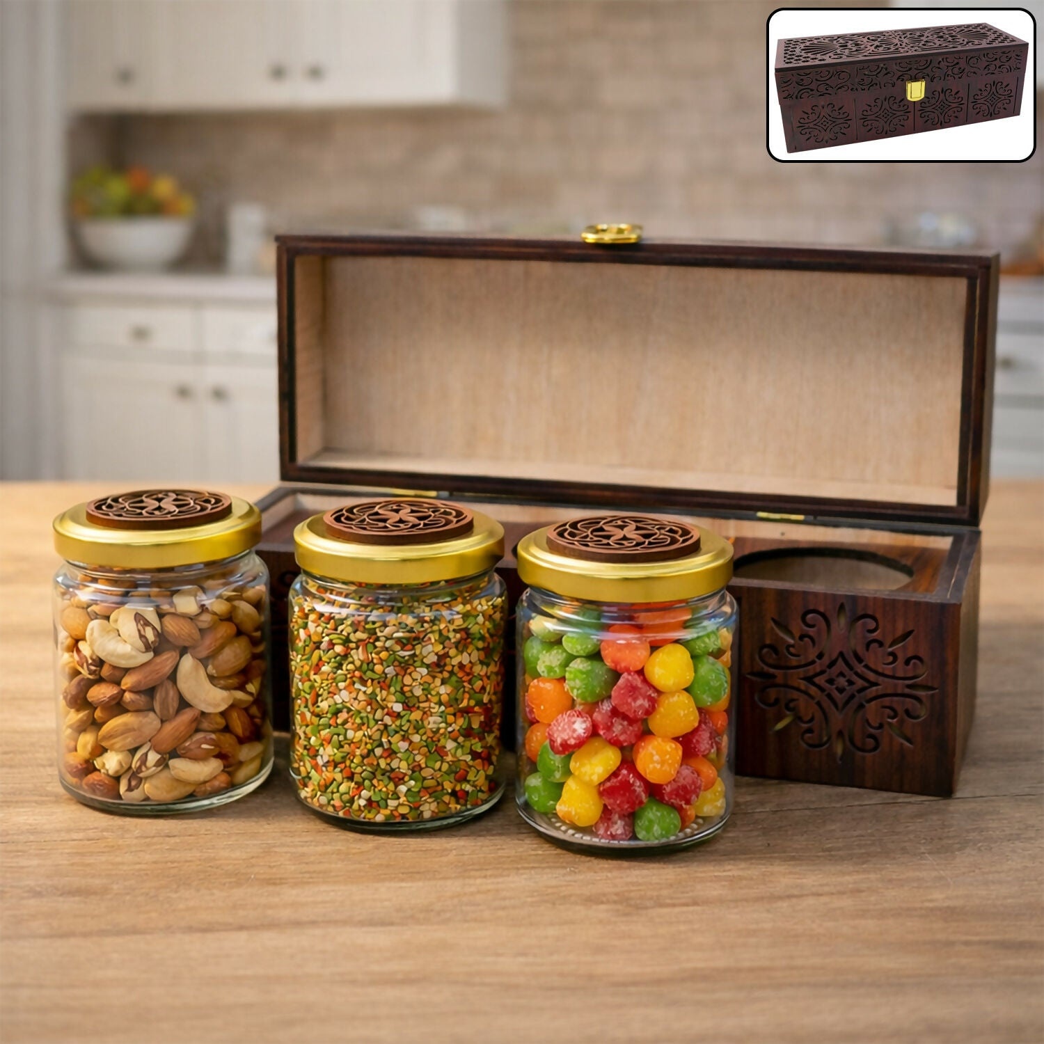 \Enhance your serving style with this beautifully crafted wooden dry fruit and mukhwas storage box featuring three transparent glass jars with secure lids. Designed with intricate carved detailing on the exterior and a sturdy hinged lid with a metallic lock, this elegant organizer is perfect for storing dry fruits, mouth fresheners, candies, seeds, and snacks. The glass jars keep contents fresh while allowing easy visibility, making it convenient for everyday use as well as special occasions. Its premium wooden finish adds a traditional yet classy touch to your dining table, kitchen counter, or living space. Ideal for festive gifting, weddings, housewarmings, and celebrations, this storage box combines functionality with decorative charm.