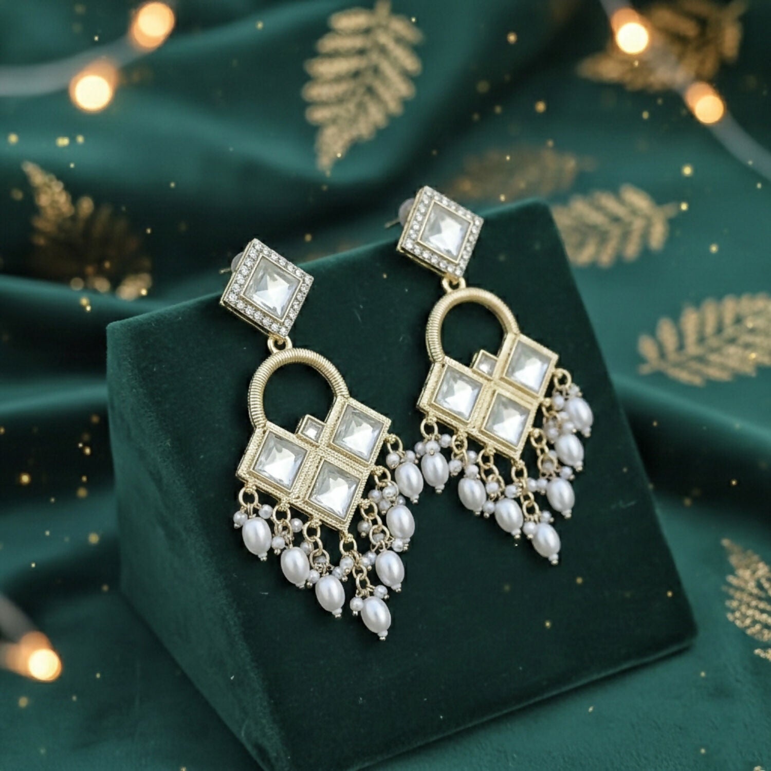 These elegant earrings combine geometric precision with traditional Indian craftsmanship, making them a standout accessory for formal occasions.