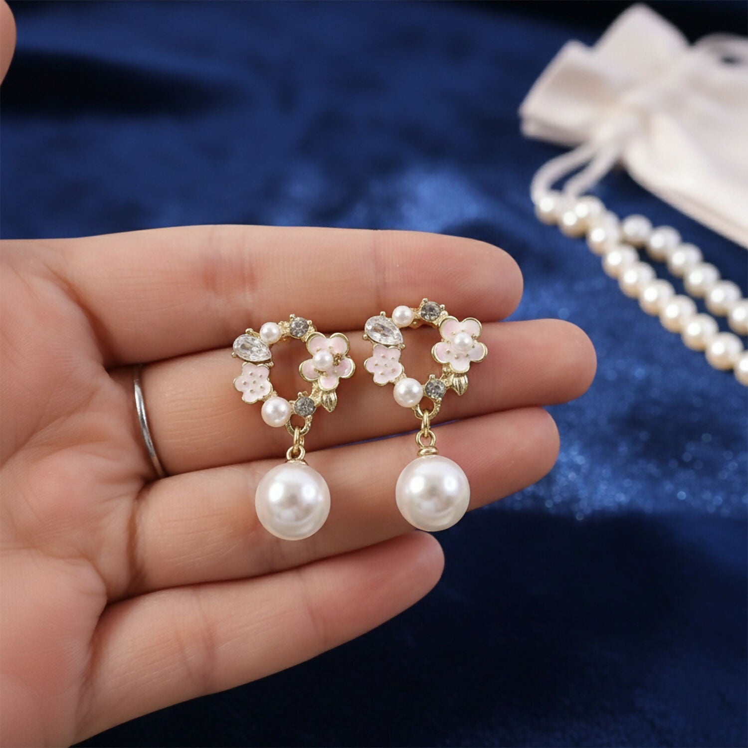 Vintage Rose Pearl Stud Earrings for Women – Elegant Gold Floral Design