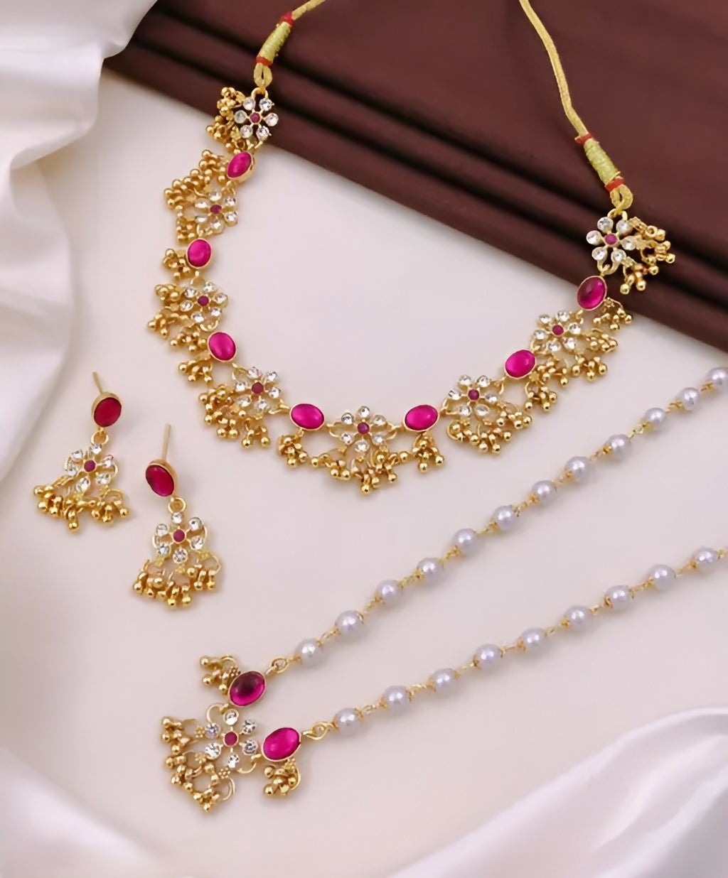 Celebrate timeless elegance with this beautifully designed gold-plated jewelry set, crafted to enhance your ethnic and bridal look. Adorned with vibrant pink stones and sparkling crystal accents, this set blends traditional charm with graceful sophistication.