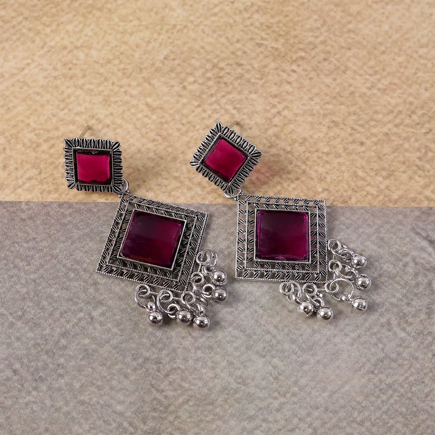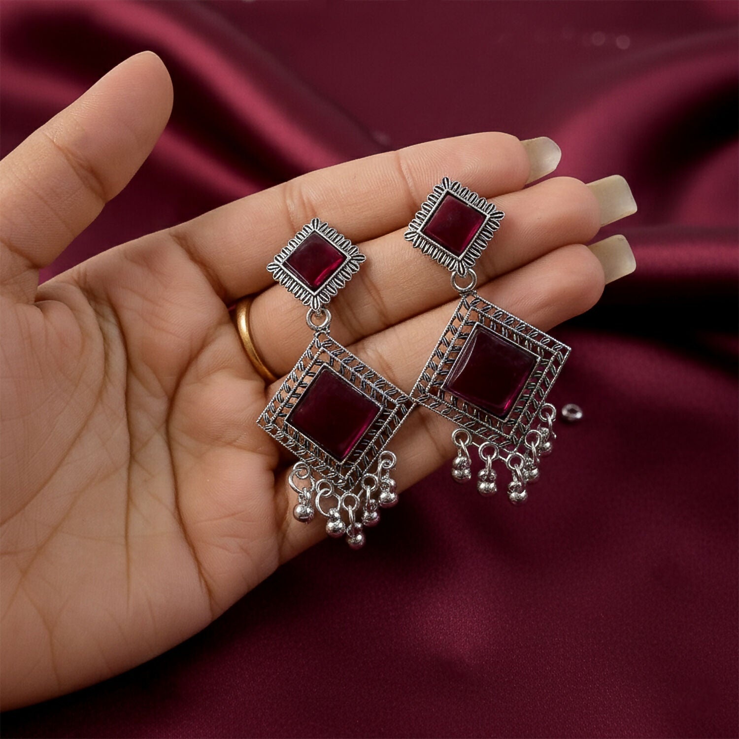 Traditional Indian Oxidised Dangler Earrings with Square Red Monalisa Stones