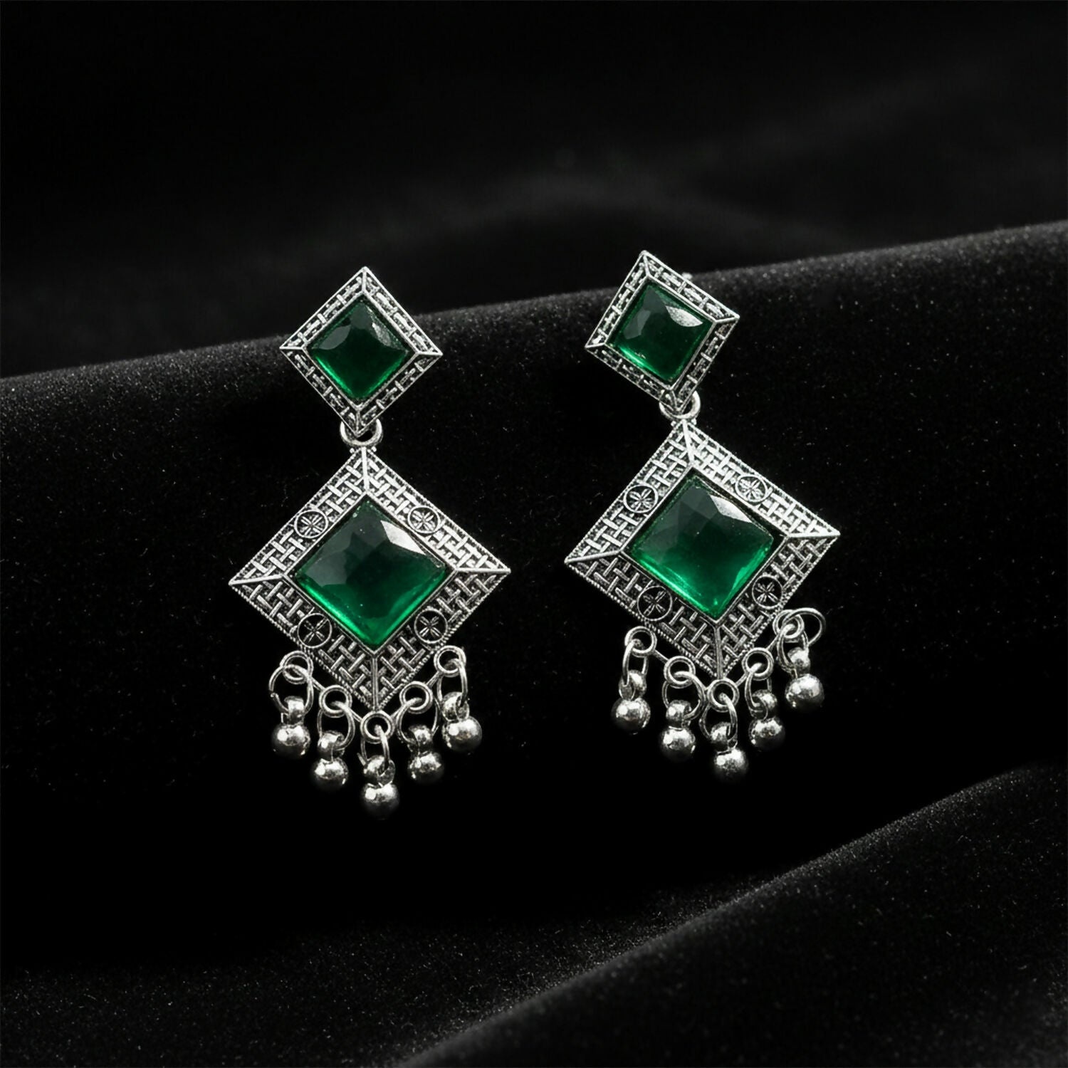 Traditional Indian Oxidised Dangler Earrings with Square Green Monalisa Stones