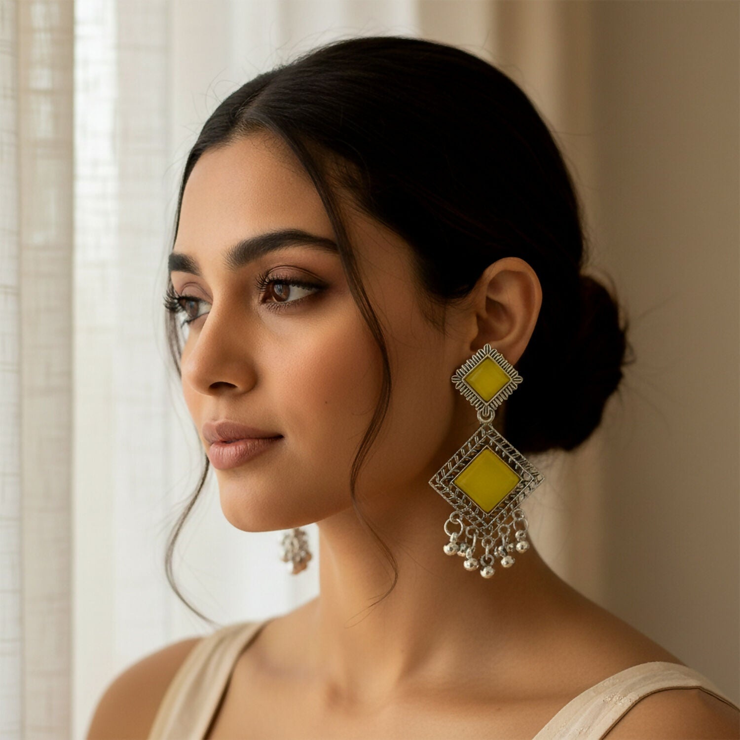Traditional Indian Oxidised Dangler Earrings with Square Yellow Monalisa Stones