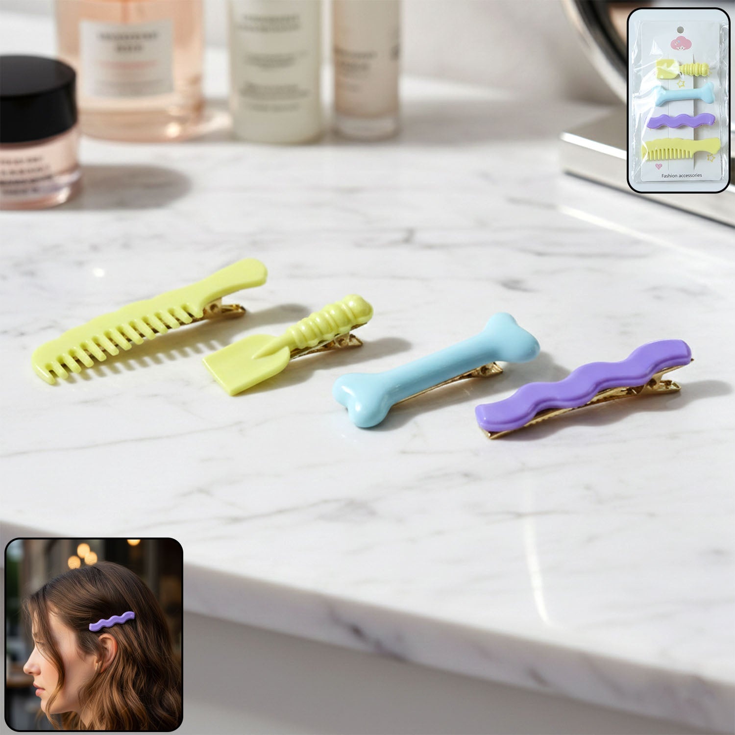 This decorative alligator hair clips set is designed to add a cute and stylish touch to everyday hairstyles. The set includes multiple uniquely designed clips that help hold hair securely while enhancing your overall look. These clips are easy to use and provide a firm grip without pulling or damaging hair. Suitable for daily wear, casual outings, or light party styling, they help manage front hair, side locks, or small sections effortlessly. A perfect blend of functionality and fashion, making it an essential hair accessory for girls and women.