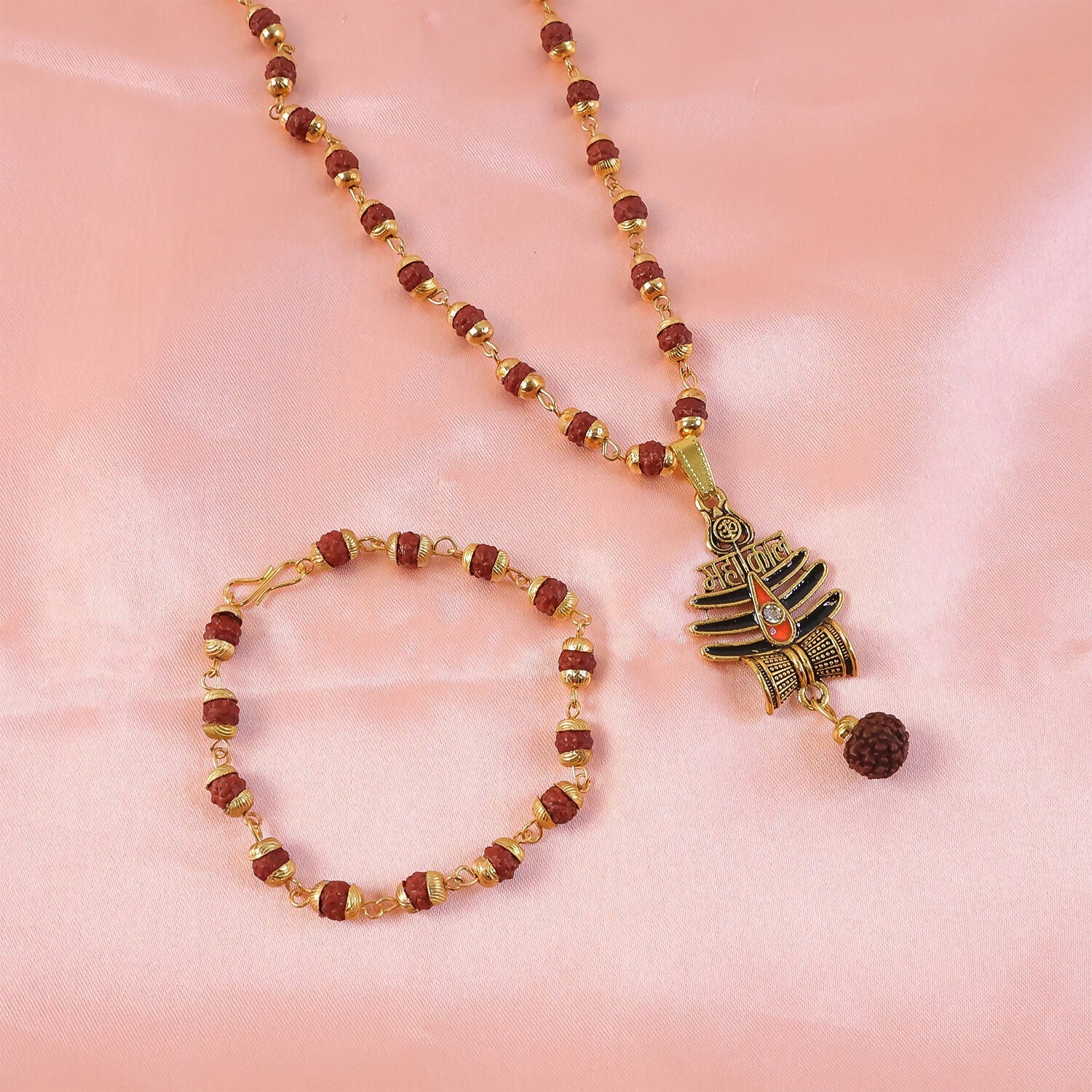 Show your devotion with this striking Gold Plated Mahakal Trishul Pendant Necklace Set. Featuring a beautifully detailed Trishul and Shivling design with sacred “Mahakal” inscription, paired with premium Rudraksha beads and gold-tone accents, this set includes a matching bracelet for a complete spiritual look. Ideal for daily wear, religious occasions, or as a powerful gift symbolizing strength, protection, and divine blessings.