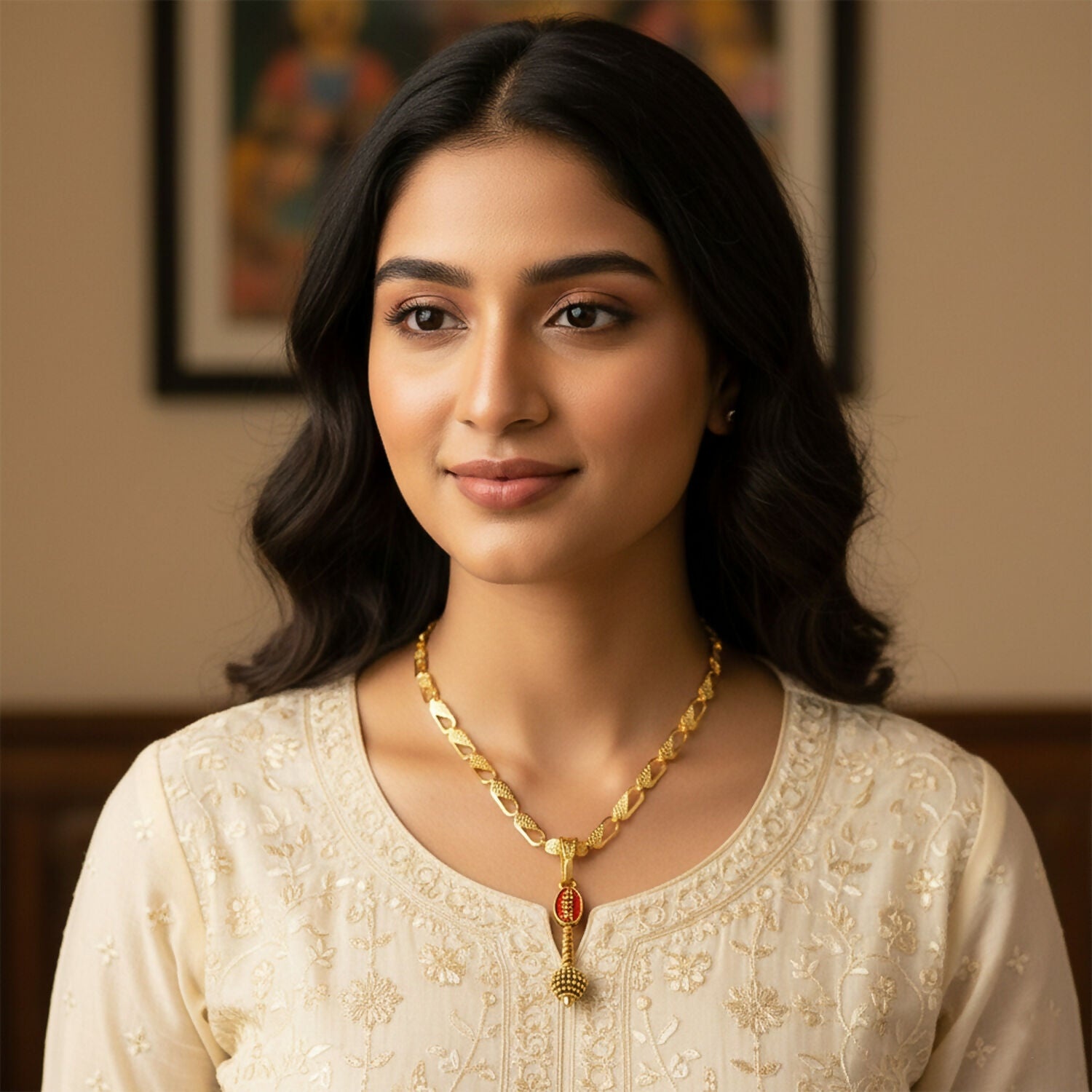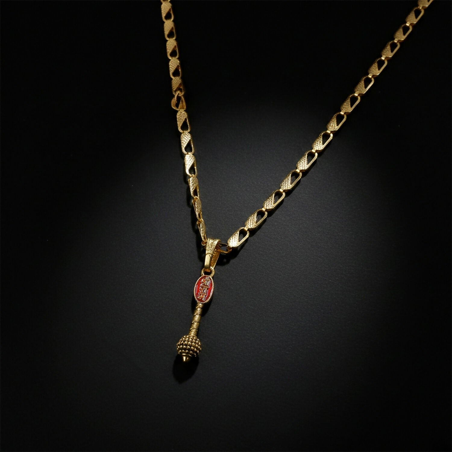 A devotional gold-toned chain necklace featuring a detailed Shree Ram gada (mace) pendant with red enamel accents. Symbolizing strength, faith, and protection, this elegant piece is perfect for daily spiritual wear, festive occasions, or as a meaningful gift for devotees