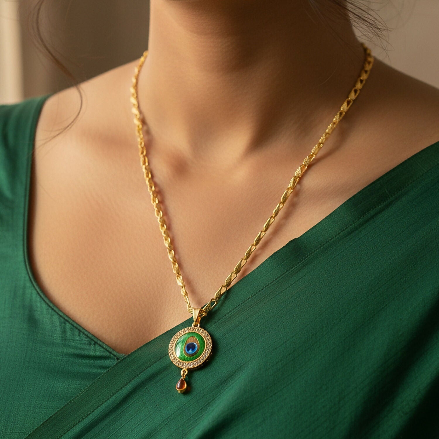 An elegant gold-toned chain necklace featuring a vibrant peacock feather–inspired stone pendant, encircled with sparkling crystal accents. Finished with a delicate drop charm, this piece adds a graceful blend of tradition and modern style—perfect for festive wear, special occasions, or thoughtful gifting.