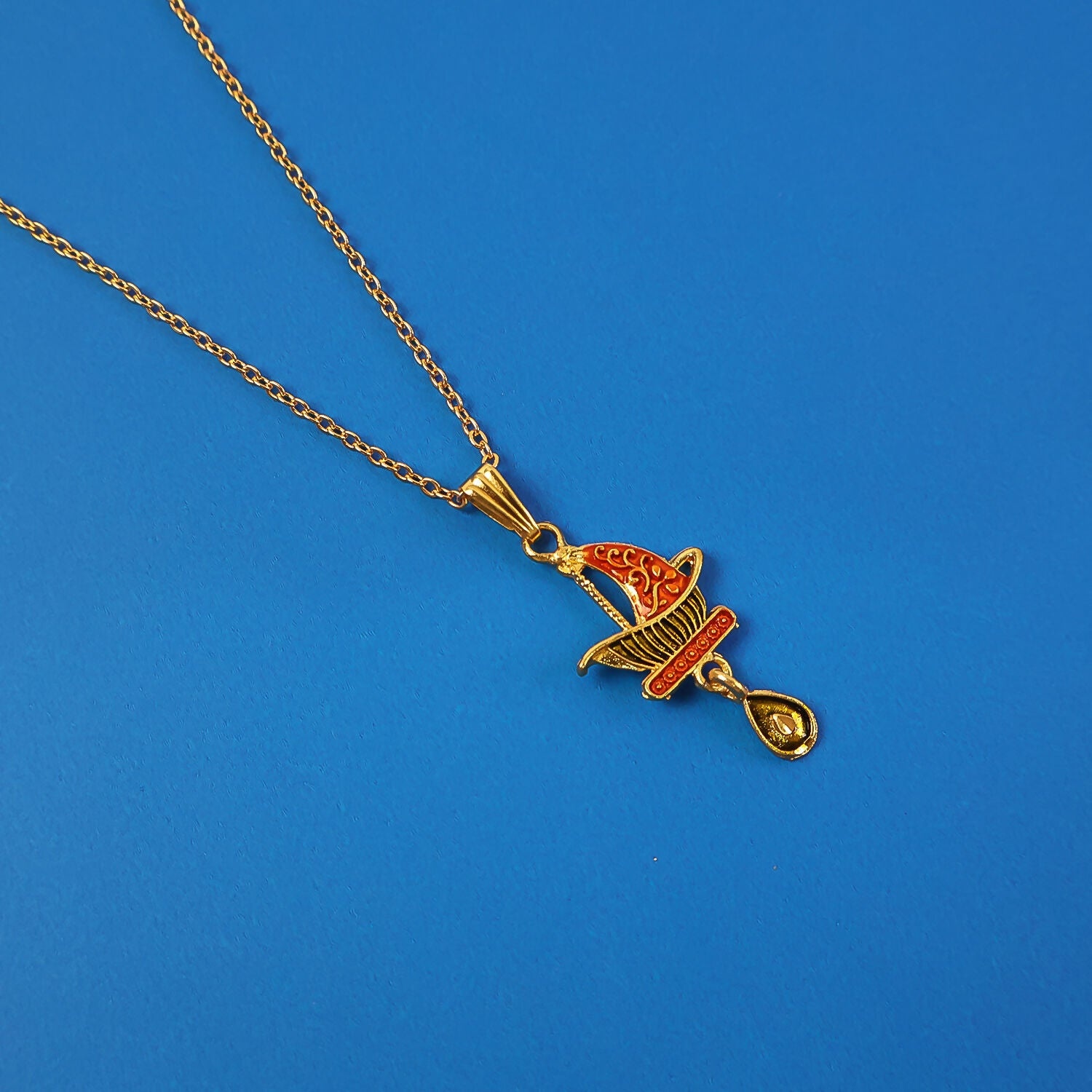 This stylish steamer boat design pendant necklace features a charming boat-inspired motif with fine detailing that adds a unique and playful character to the piece. The structured form with a small hanging accent gives the pendant a balanced and eye-catching look. Paired with a sleek chain, this necklace is suitable for everyday wear as well as casual and special occasions. Its distinctive design pairs beautifully with modern, fusion, and festive outfits, making it a standout addition to any jewelry collection.