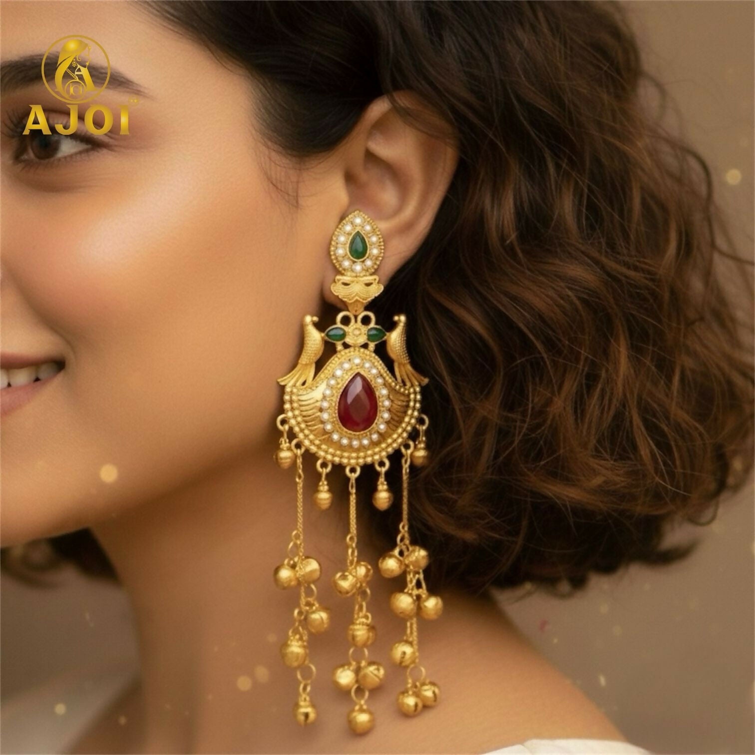 The highlight of this design is the dramatic cascade of multi-layer golden ghungroo chains, each bead meticulously crafted to deliver graceful movement and a festive sound. These dangling chains shimmer brilliantly, catching light with every turn, making the earring perfect for weddings, cultural events, festive celebrations, and grand traditional occasions.