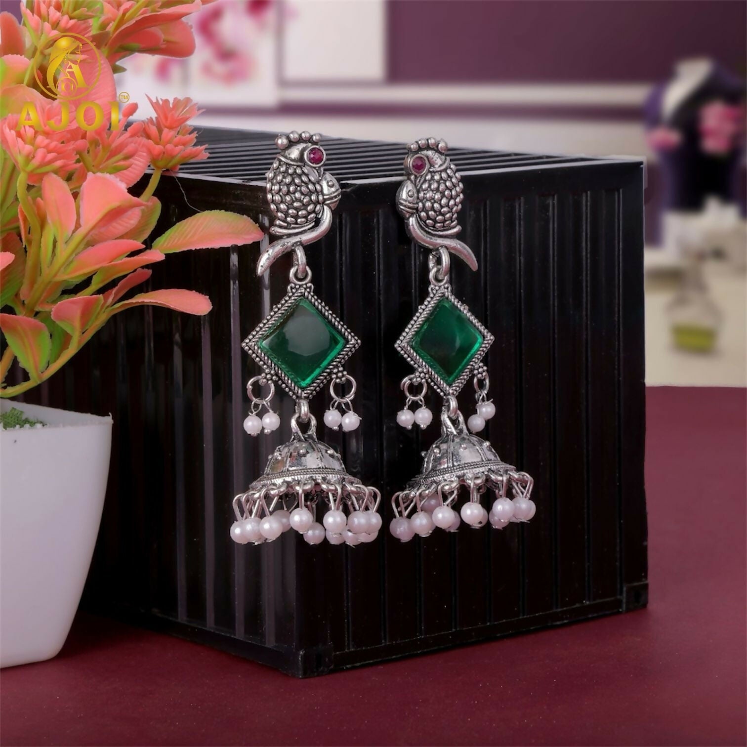 These stunning oxidised silver jhumka earrings feature a detailed parrot-shaped stud, a vibrant green square stone, and classic pearl-beaded dome jhumkas. Designed with a perfect mix of traditional and contemporary style, these earrings elevate any ethnic or festive outfit.Green stone jhumka, oxidised silver earrings, parrot design earrings, ethnic jewellery for women,oxidised jhumki, traditional jhumka, pearl dangler earrings, party wear earrings, Indian oxidised jewellery.