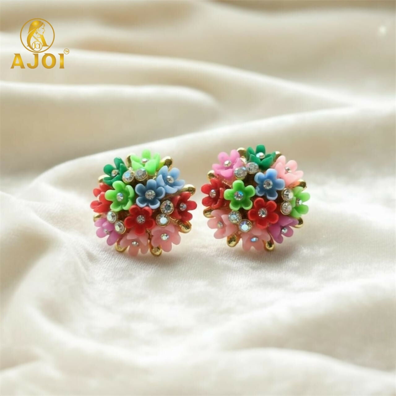 Add a pop of color and charm to your jewellery collection with these beautiful Multicolor Floral Crystal Stud Earrings. Designed to resemble a vibrant bouquet, each earring features a cluster of tiny, delicate flowers in pastel and bright shades including pink, blue, red, and green. Sparkling rhinestone crystals are placed at the center of several flowers, giving the studs a shimmering, luxurious finish.