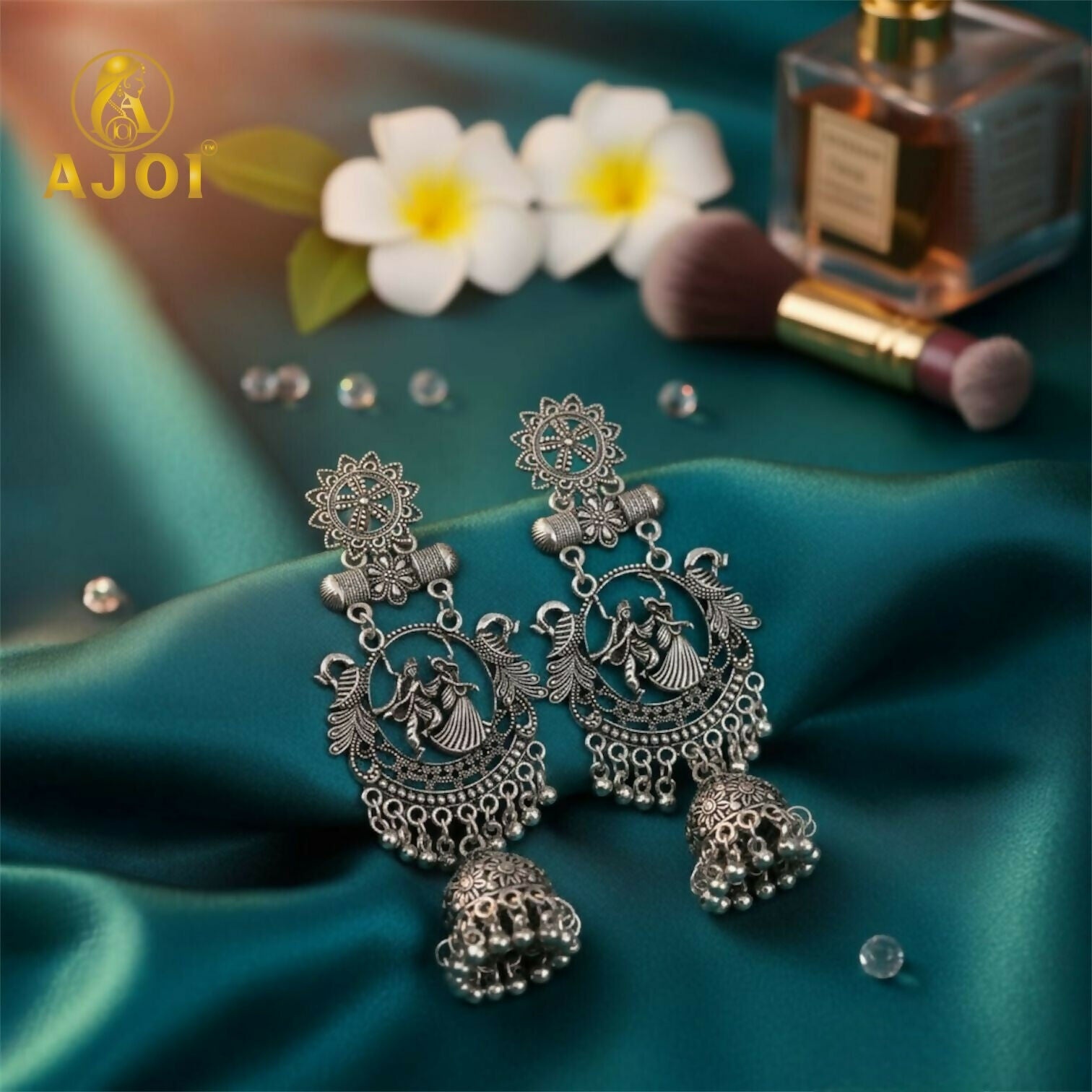 Set on rich teal fabric with fresh flowers and beauty elements in the background, the earrings exude a serene, traditional aesthetic—perfect for weddings, festive celebrations, classical dance, religious events, or cultural gatherings.