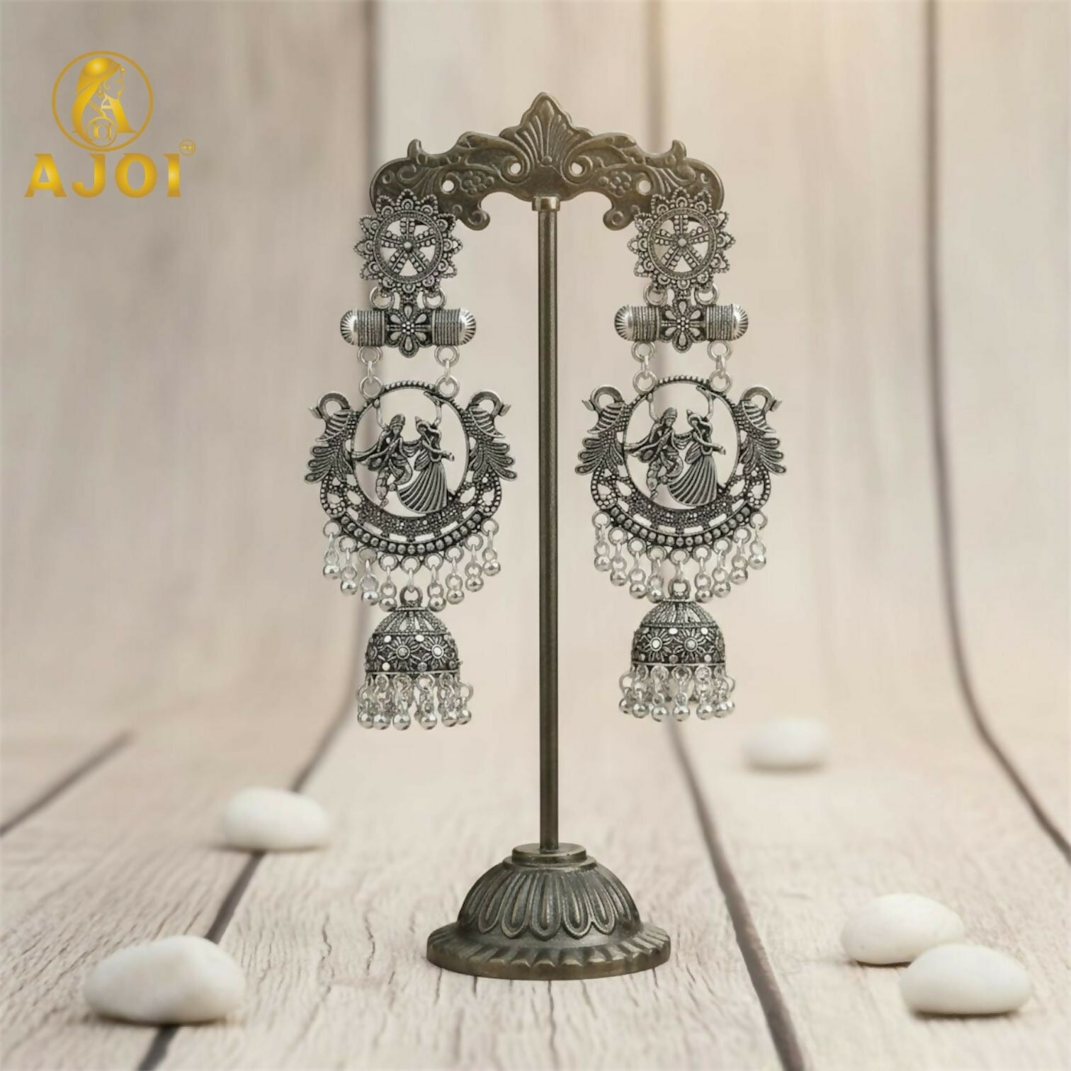 These exquisite earrings are a celebration of devotion, art, and heritage. Crafted in high-quality oxidised silver, the centerpiece beautifully features Radha Krishna engraved within a circular frame, symbolizing eternal love and divine grace. The intricate detailing reflects fine temple craftsmanship, enhanced with traditional patterns and ornate carvings.