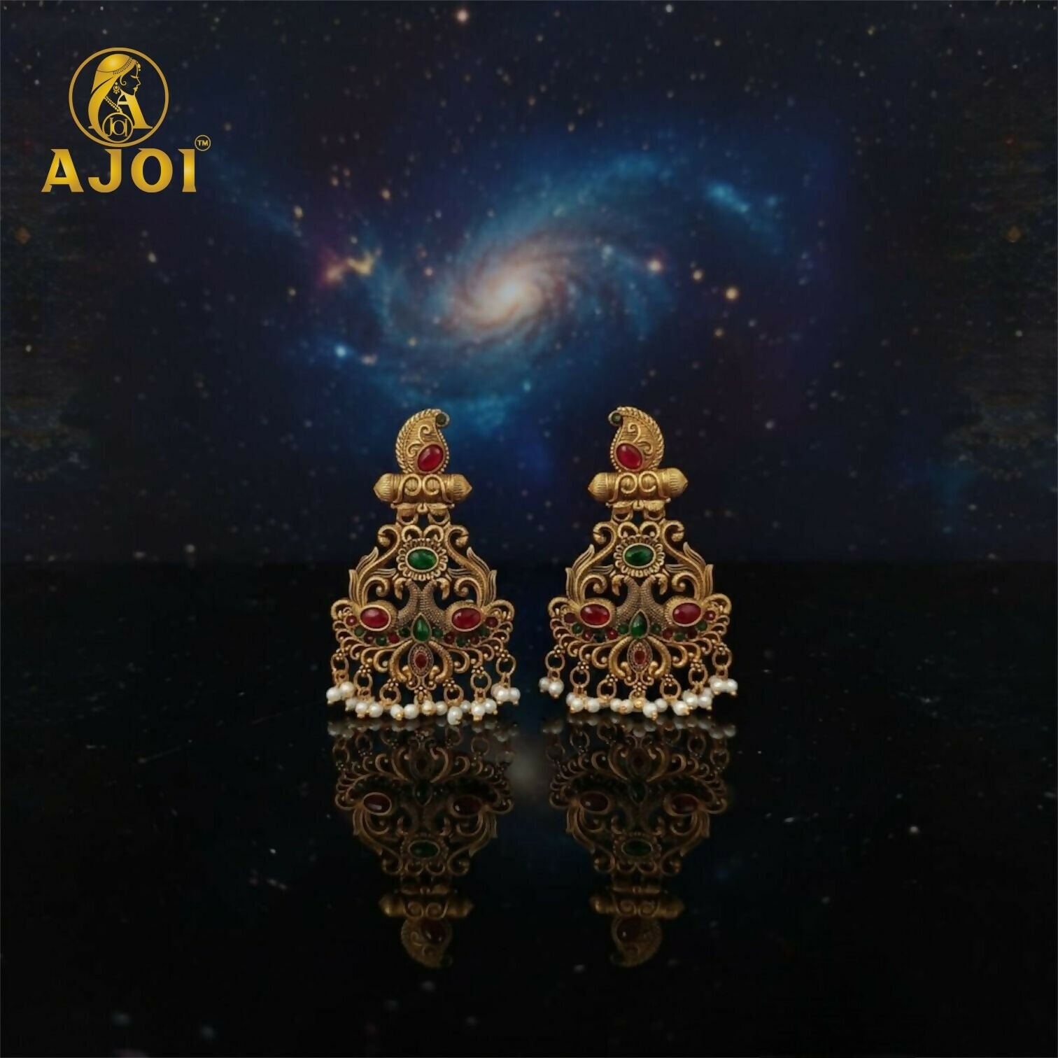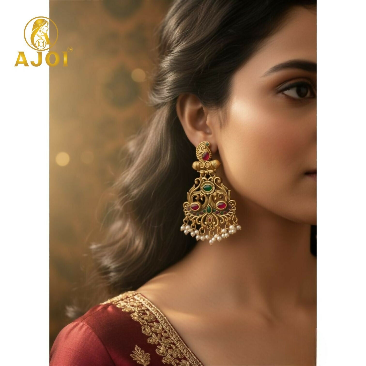 These exquisite earrings embody the richness of traditional temple jewelry, crafted in a beautiful matte antique gold finish that reflects heritage and grandeur. The design showcases intricate curves and motifs adorned with deep red and green stones, symbolizing prosperity and elegance. Every detail speaks of fine craftsmanship—especially the lower section embellished with delicate white pearl droplets that create a graceful sway with every movement.