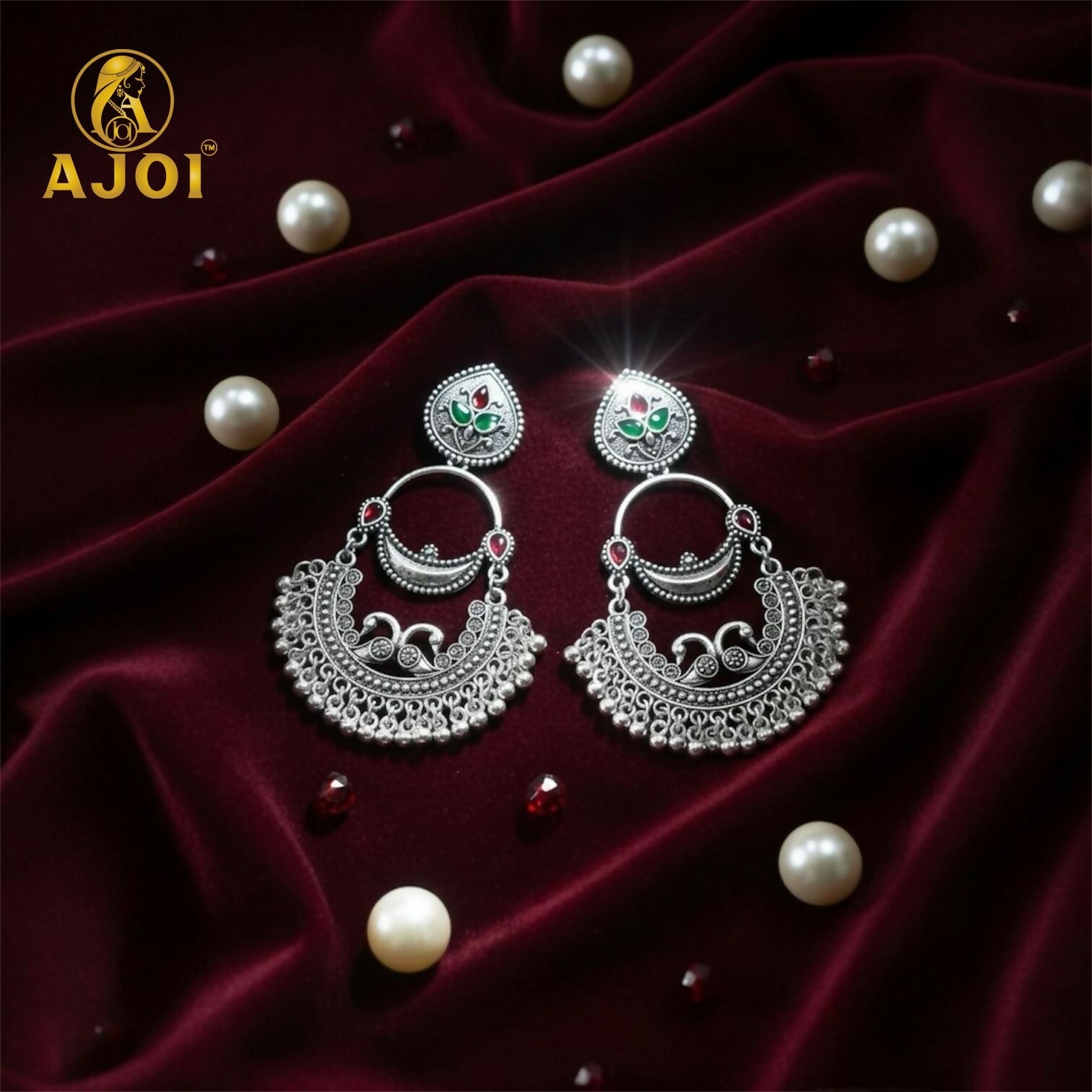 Placed on a luxurious maroon velvet backdrop, the earrings reflect sophistication and luxury, surrounded by scattered pearls that highlight their rich traditional aesthetics.