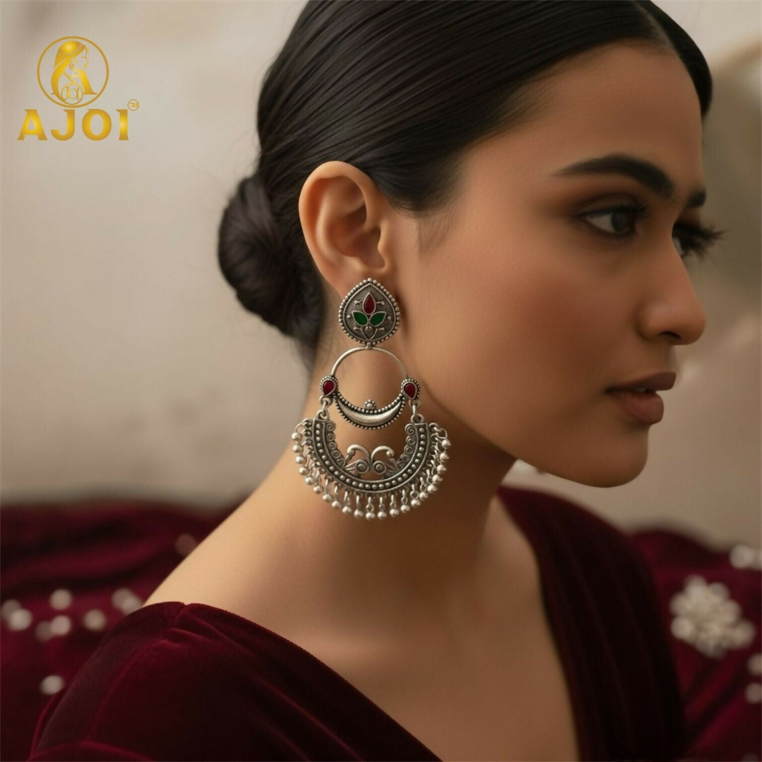 The stud top is beautifully embellished with green and maroon enamel floral motifs, giving a classic Indian heritage appeal. Dangling silver beads along the lower curve create a rhythmic pattern, making the earrings eye-catching and ideal for festive occasions, weddings, or cultural celebrations.