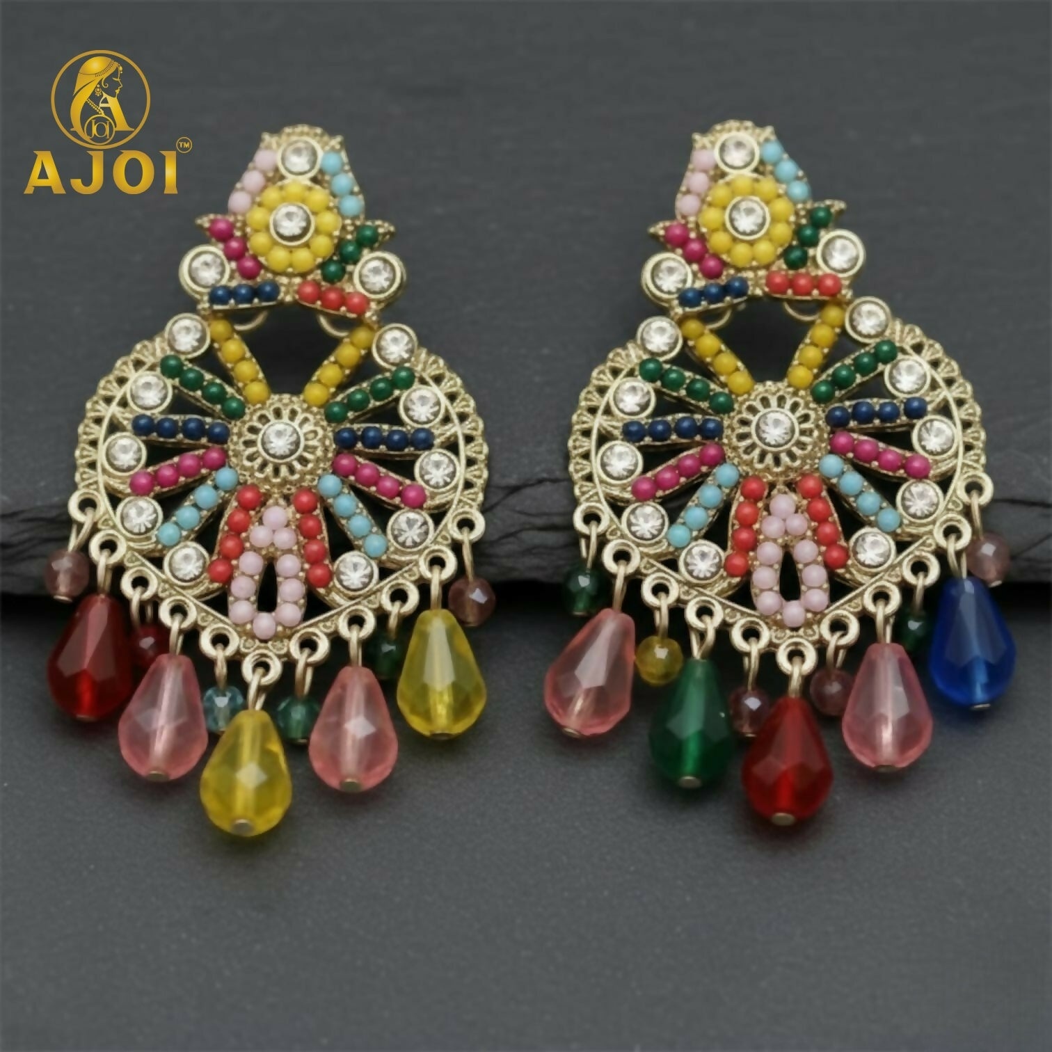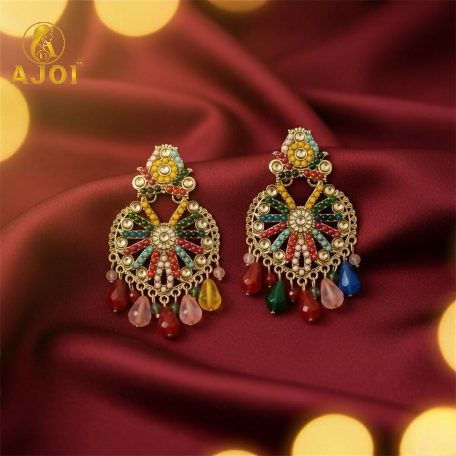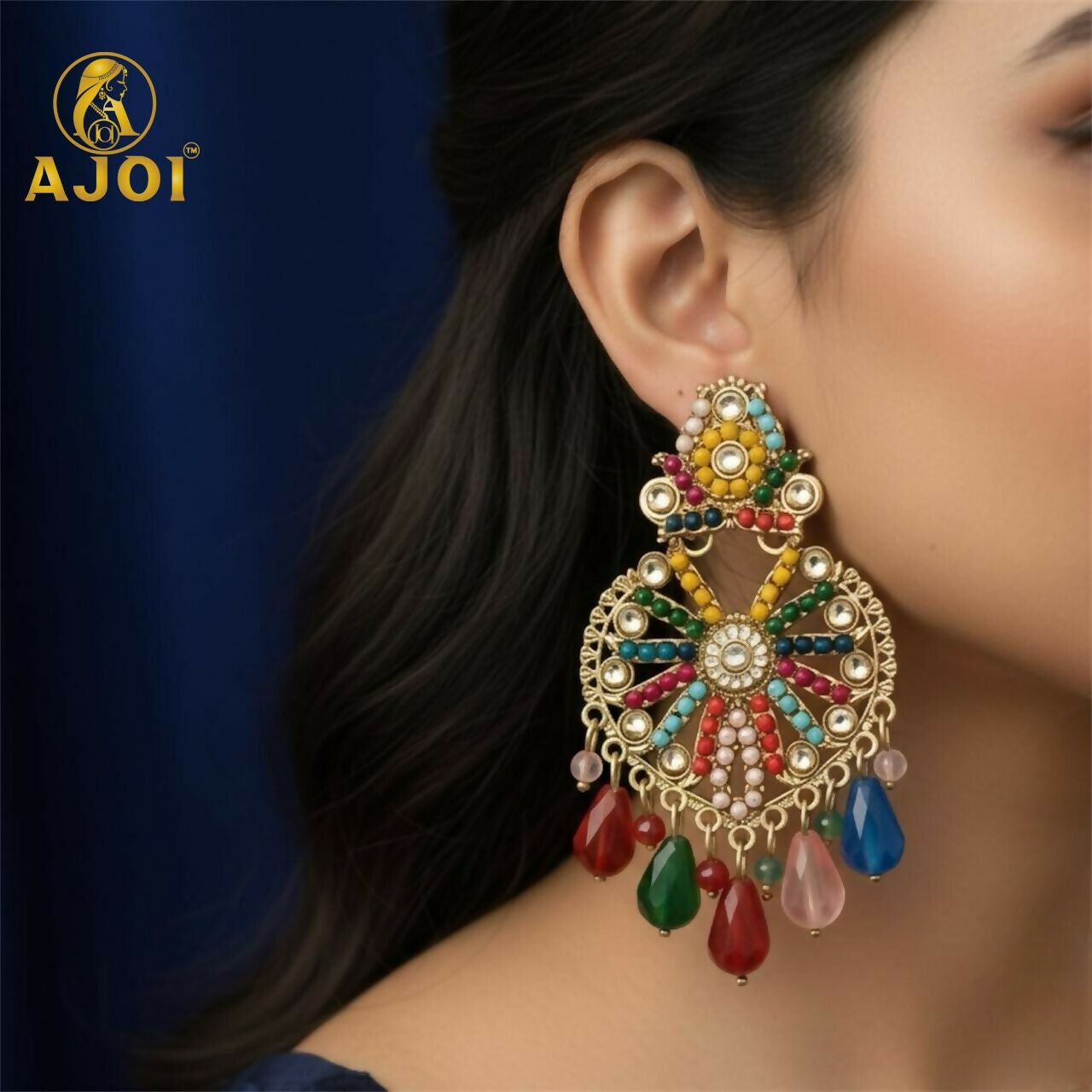 These bold and vibrant chandbali-style earrings feature a beautiful arrangement of multicolored beads, creating a festive and eye-catching design. Crafted with intricate detailing, the earrings display radiant hues including red, blue, green, pink, yellow, and pearl tones — making them perfect for anyone who loves bright, statement-making jewelry.