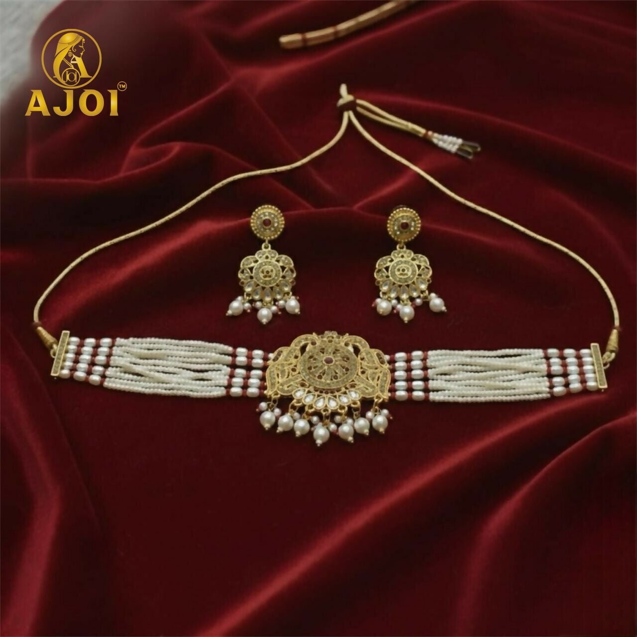 This elegant choker-style necklace features a stunning combination of premium white pearls and antique gold detailing, crafted to bring a perfect balance of tradition and luxury. The centerpiece is intricately designed with a rich temple-inspired motif, showcasing fine filigree artistry that adds royal charm to the entire piece.