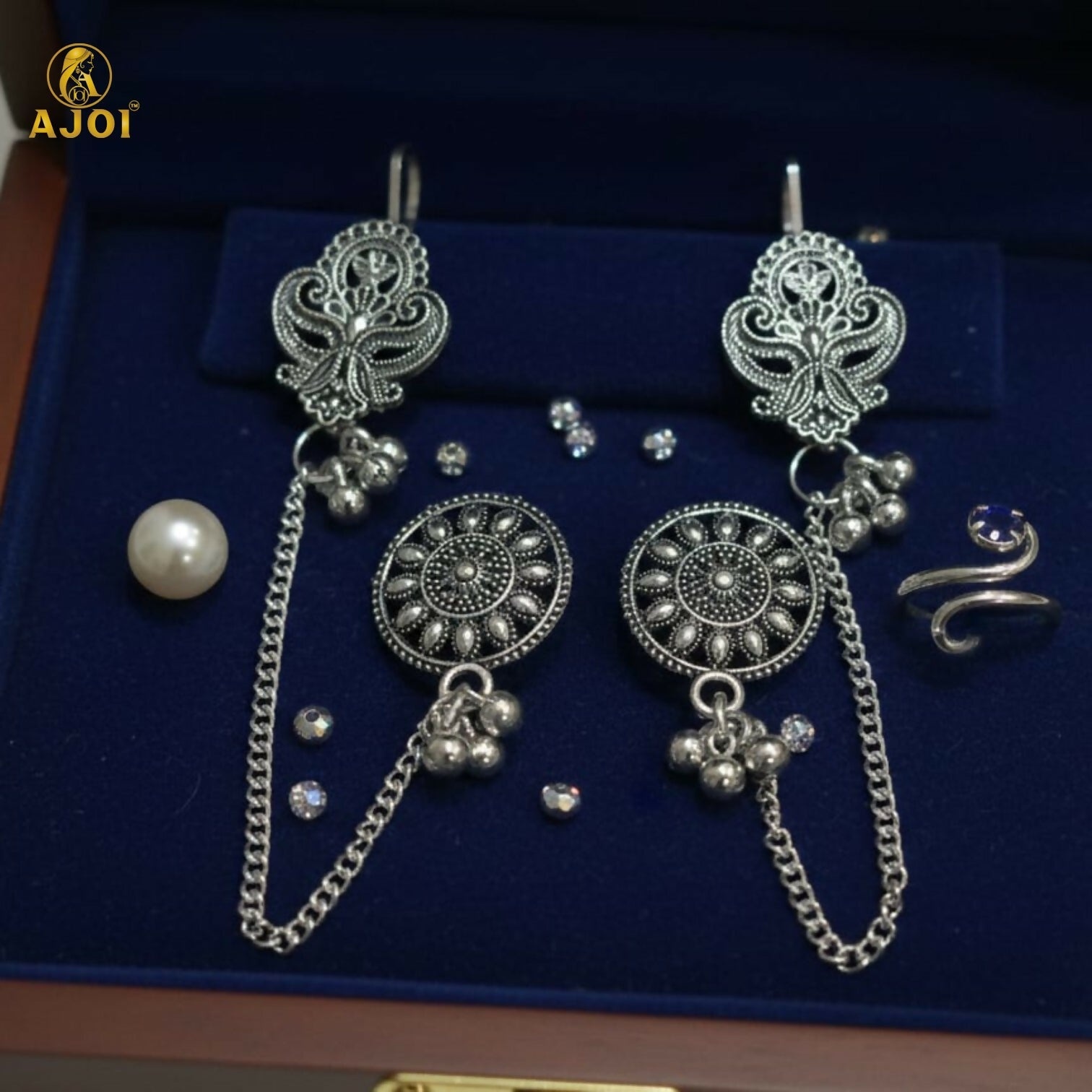 Enhance your ethnic charm with these beautifully crafted Oxidized Silver Chain Drop Earrings. Designed with intricate traditional detailing, these earrings feature a floral mandala motif paired with delicate ghungroo beads and a stylish side chain that adds a unique Indo-tribal touch.