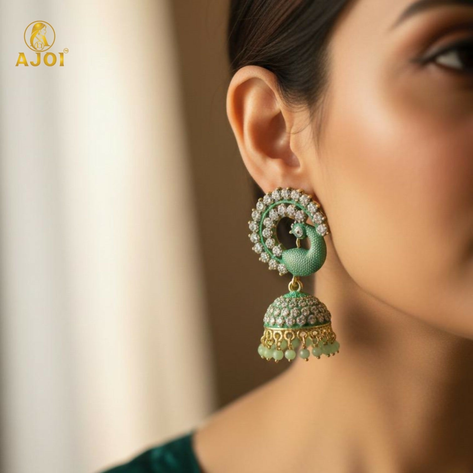 These elegant Mint Green Peacock Stone Jhumka Earrings are a beautiful fusion of traditional charm and modern aesthetics. The upper stud features a graceful peacock-inspired design, highlighted with shimmering clear stones arranged in a circular feather pattern that catches the light beautifully. The mint green textured finish adds a fresh and luxurious touch.