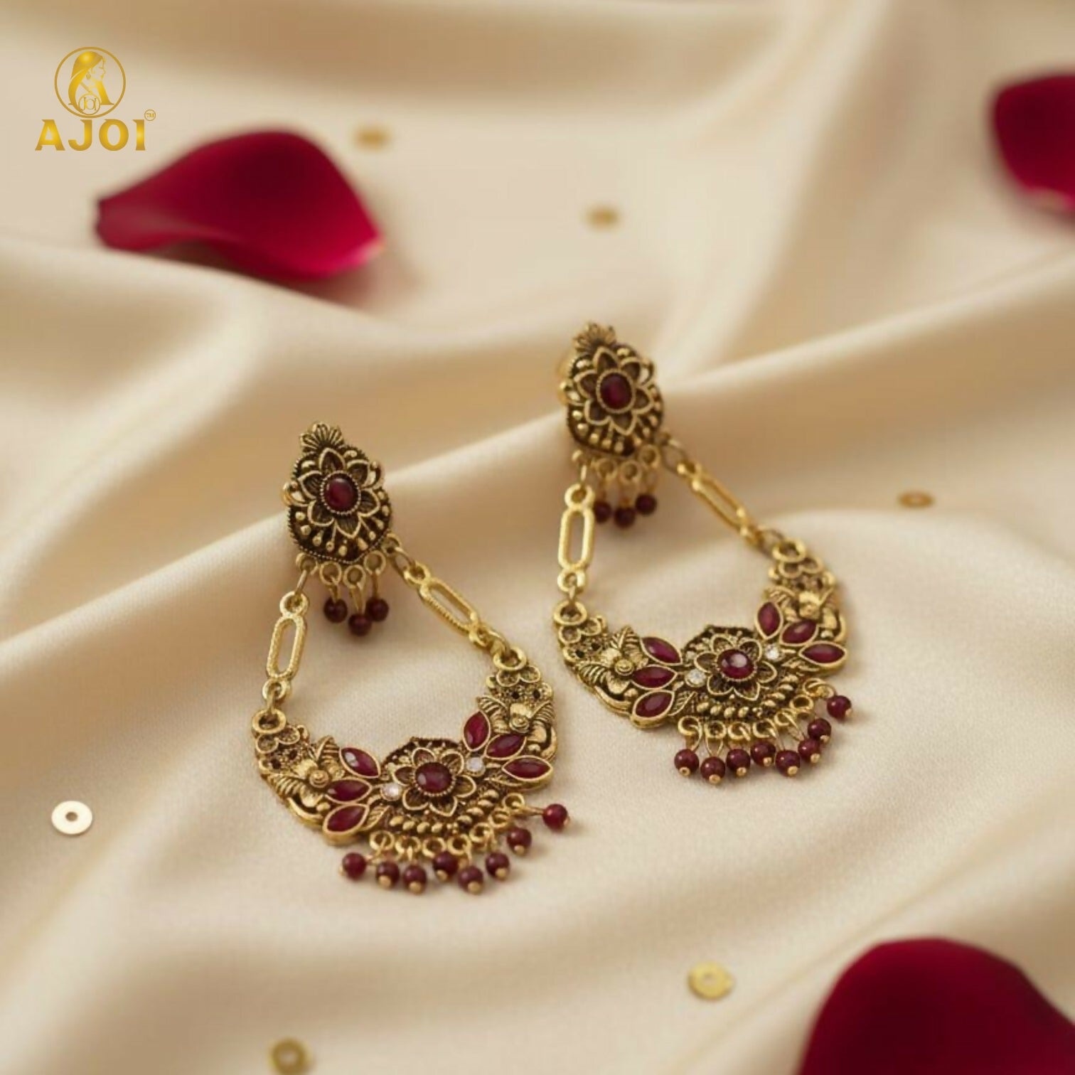 Enhance your ethnic look with these stunning Vintage Maroon Floral Chandbali Earrings, designed with traditional artistry and antique royal charm. The chandelier-style silhouette features intricate floral motifs highlighted with rich maroon enamel accents, giving the earrings a regal and elegant appeal.