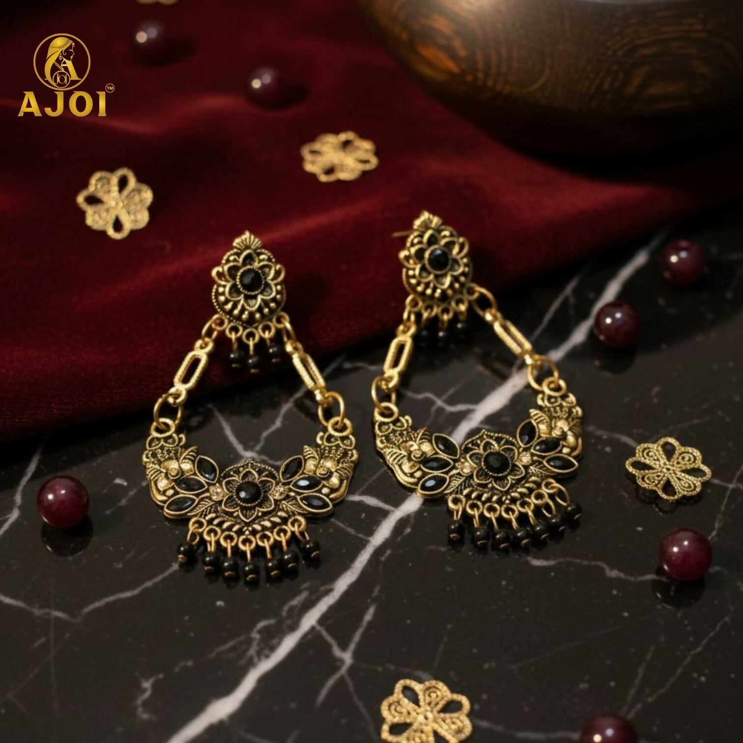 Elevate your ethnic elegance with these exquisitely crafted AJOI Antique Gold-Plated Chandbali Earrings. Designed with intricate floral motifs and enriched with deep black stones, these earrings reflect timeless Indian artistry blended with royal charm. The graceful chandbali silhouette, detailed filigree work, and delicate hanging beads make them a statement piece for festive and traditional occasions.