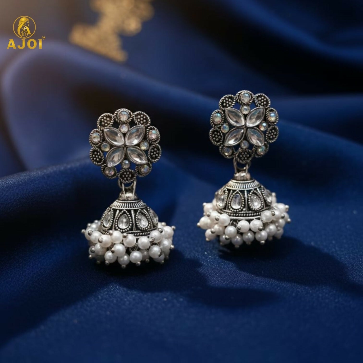 Enhance your traditional look with these exquisite oxidized silver jhumka earrings, beautifully crafted with a floral motif studded with shimmering stones. The intricate detailing is complemented by graceful clusters of pearl drops, adding timeless elegance and charm. Perfect for festive occasions, weddings, or ethnic wear, these earrings effortlessly blend classic artistry with contemporary style. Lightweight yet striking, they are designed to make a statement while ensuring comfort all day long.