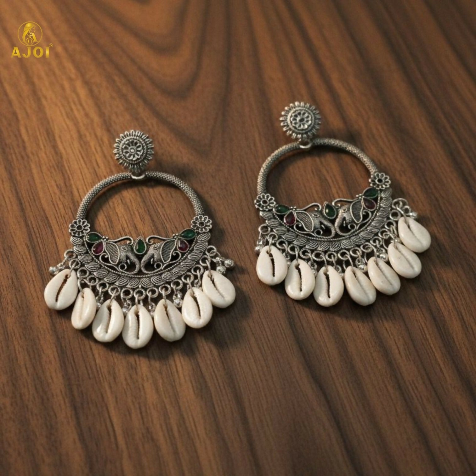 Royal Elephant Oxidized Silver Shell Chandbali Earrings with Handcrafted Motifs